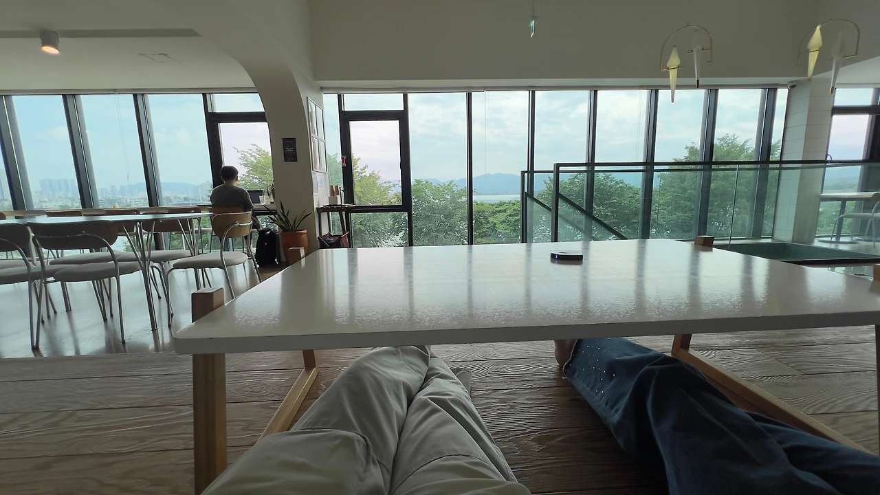 반짝이는 조명 대신 잔잔한 호수가 우리를 맞았다. 한 카페에 들어섰다. 창밖으론 호수가 보이고, 커피 향이 은은하게 퍼졌다. 남편은 옆에서 책을 읽고 있었다.
