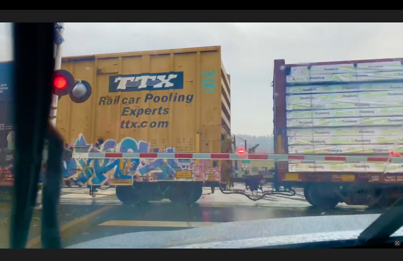 차를 멈춘 순간, 철컹거리는 소리와 함께 기차가 코앞에서 지나갔다.