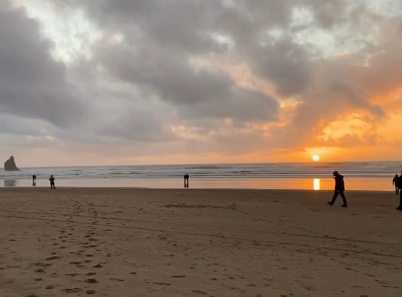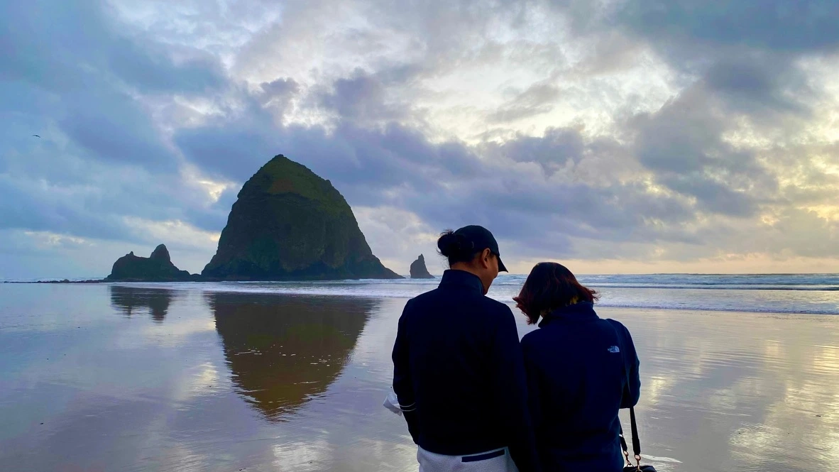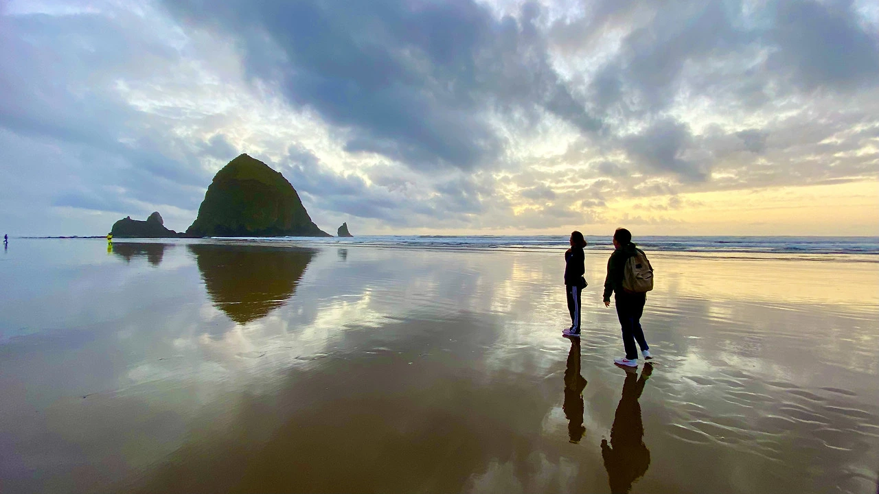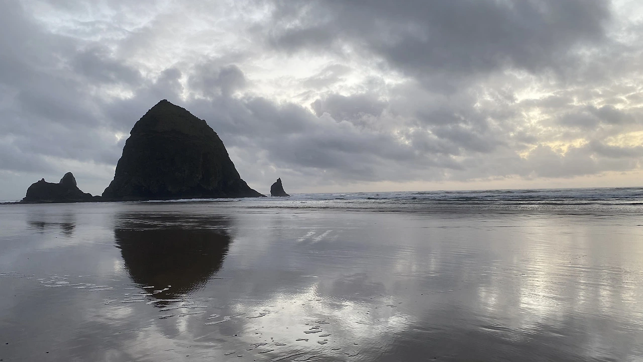 멀리 Haystack Rock은 고요한 실루엣으로 서 있었고,