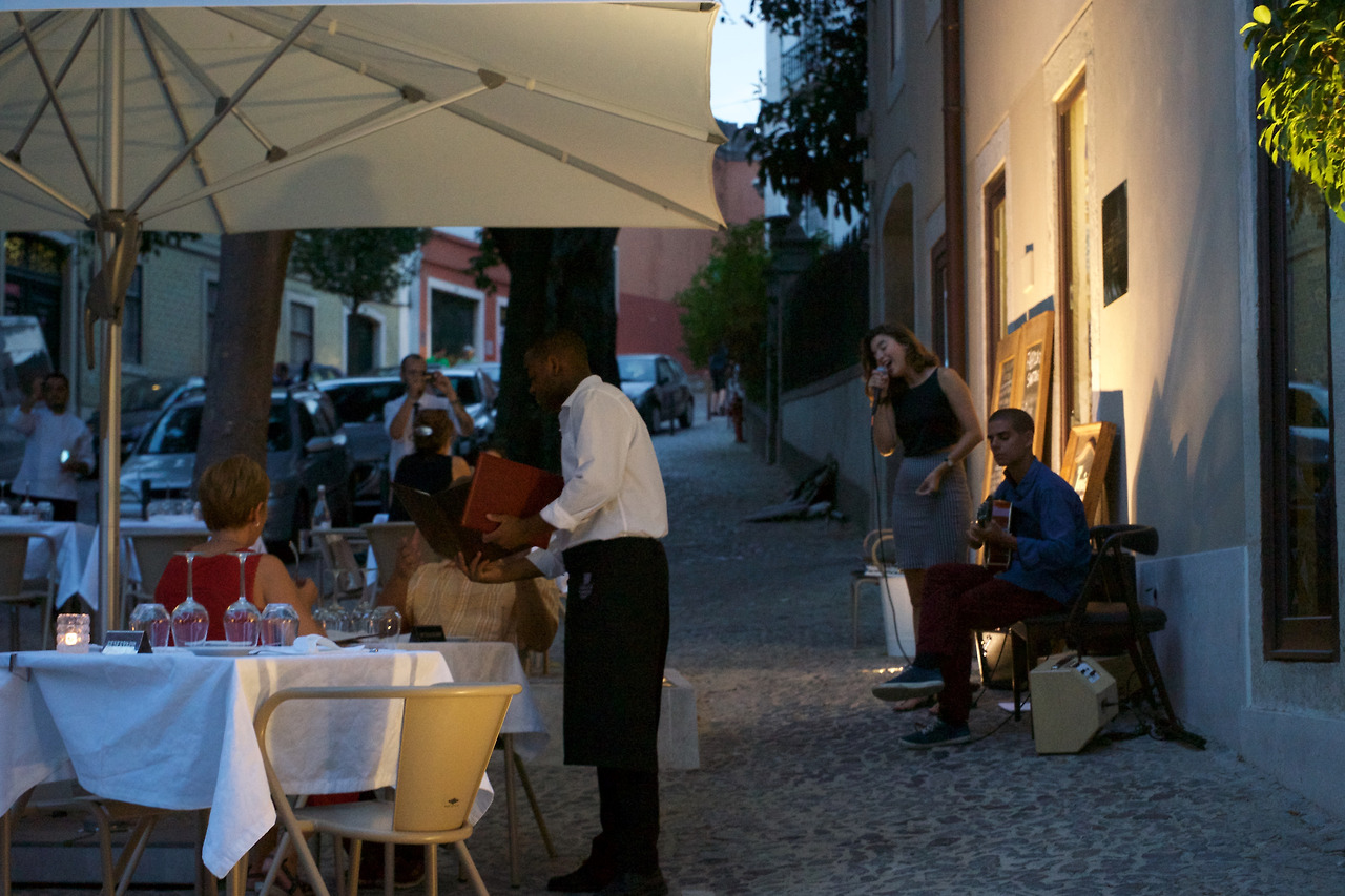 호기심 쟁이 처룽이가 손가락으로 가리킨 쪽을 보자, 강가 쪽으로 확 터진 발코니가 나온다. 가까이 다가가니 앞으론 테주강이 보이고 옆으론 빨간 지붕의 아기자기한 집들이 눈에 들어온다. 그리고 구불구불한 거리를 따라 노란 불을 켠 트램이 달린다. 불도 많지 않은 이 빈티지한 산동네에 이렇게 예쁜 곳이 숨어 있다니. 유럽의 여유로운 마을이라는 주제로 사생 대회를 하면, 꼭 등장할 법한 풍경이다. 우리가 그렇게 우연히 도착하게 된 곳은 바로 ‘솔 전망대’라는 곳이었다. 알파마 지구의 둘째 가라면 서러워할 뷰포인트. 계획한 것도 아니었으나 계획하지 않았기에 깜짝 선물 같이 반가운 곳이었다. 거리엔 라이브로 노래를 부르는 가수도 있고 야외에 테이블을 펼쳐 놓은 이곳이라면 아무 곳에나 무엇을 먹으나 흡족할 것 같은 시간이었다.
