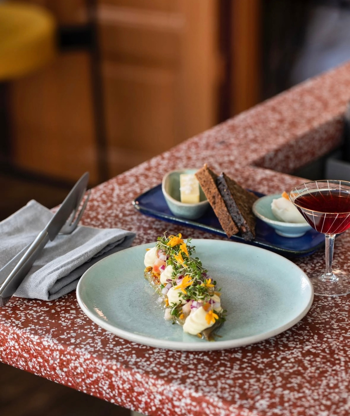 점심 메뉴는 덴마크 전통 스뫼레브뢰(Smørrebrød)를 현대적으로 재해석한 요리로 구성됩니다. 바두반 향신료로 맛을 낸 청어 요리, 예루살렘 아티초크와 새우를 곁들인 오픈 샌드위치 등 친숙하면서도 새로운 맛을 선사하는 메뉴들은 큰 호평을 받고 있습니다. 이 메뉴들은 스뫼레브뢰 전문가 리사 구드베르그 발리사게르(Lisa Gudberg Ballisager)의 손길로 탄생했습니다.