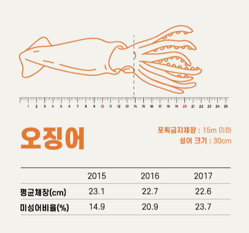 문제는 법적 금지체장이 오징어 수산자원 관리에 실효성이 없다는 점이다. 일반적으로 어떤 어종의 50% 이상이 최초로 산란 가능한 수준에 도달하는 크기를 '50% 군 성숙 크기'라고 하는데, 살오징어의 50% 군 성숙 크기는 외투장 기준 20cm 이다. 해수부는 단계적으로 금지체장을 19cm까지 상향할 계획을 세우고 있으나 어업현장의 반발이 심해 적용이 어려운 실정이다.