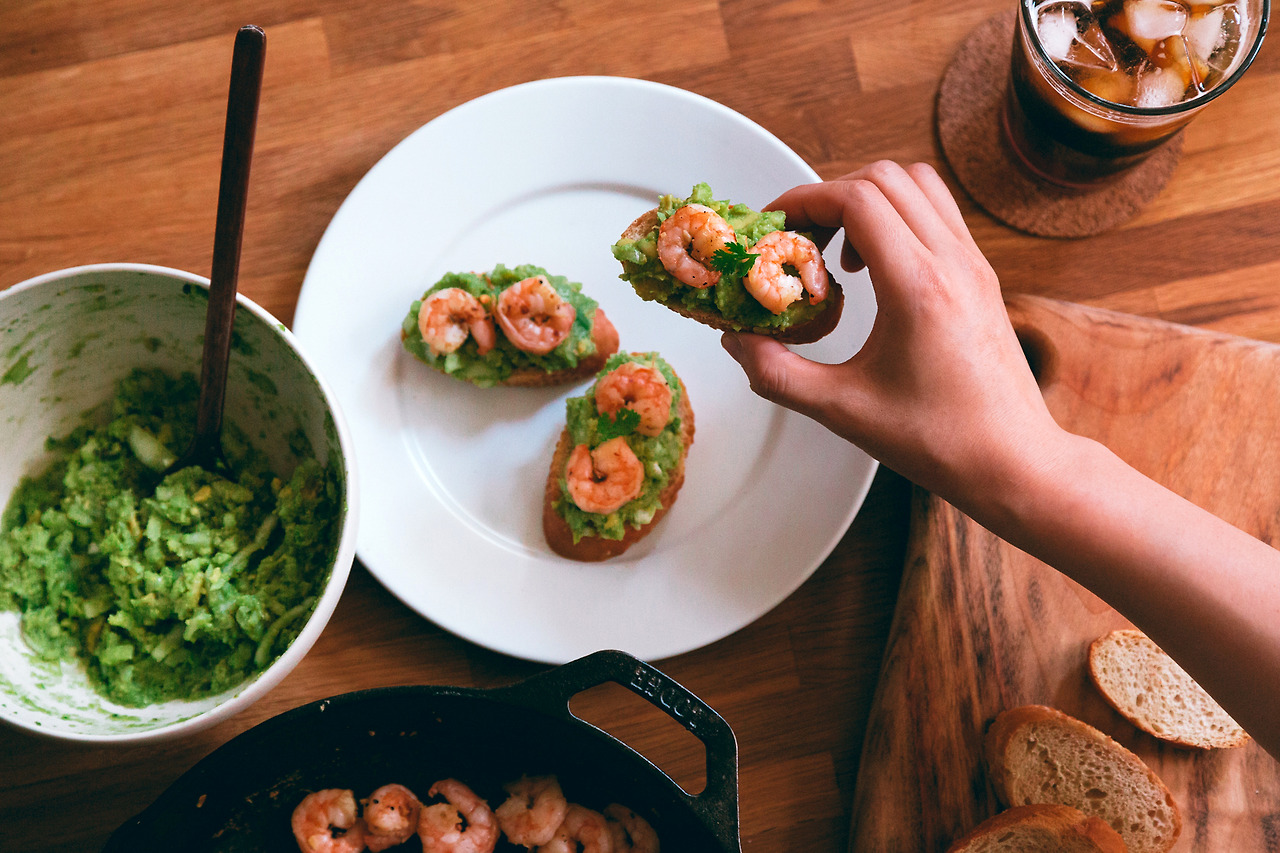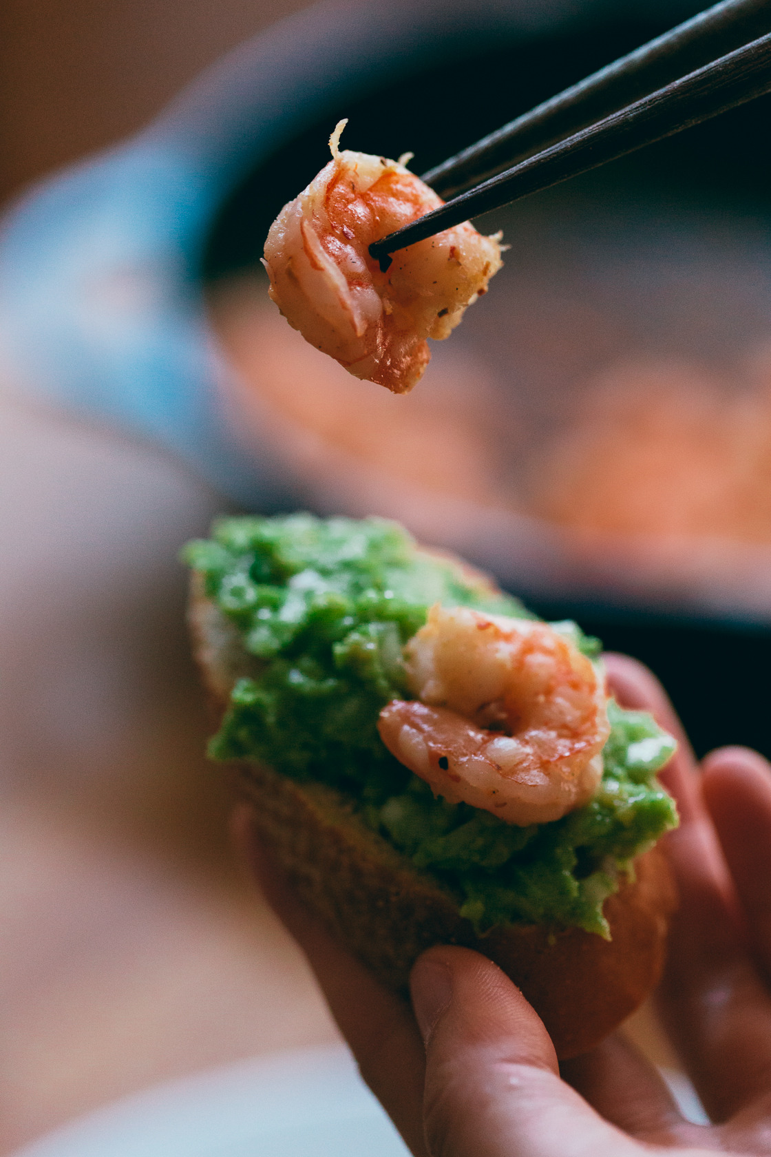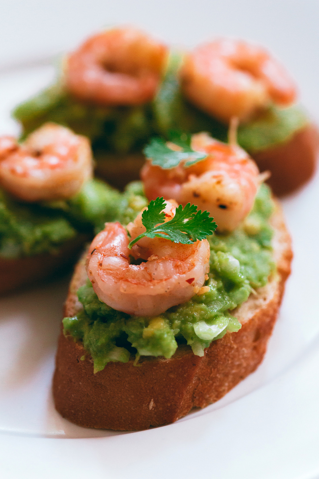 - 바삭하게 구워진 바게트 위로 아보카도 베이스를 펴 바르고 시즈닝 한 새우 2-3마리를 얹어준다.
