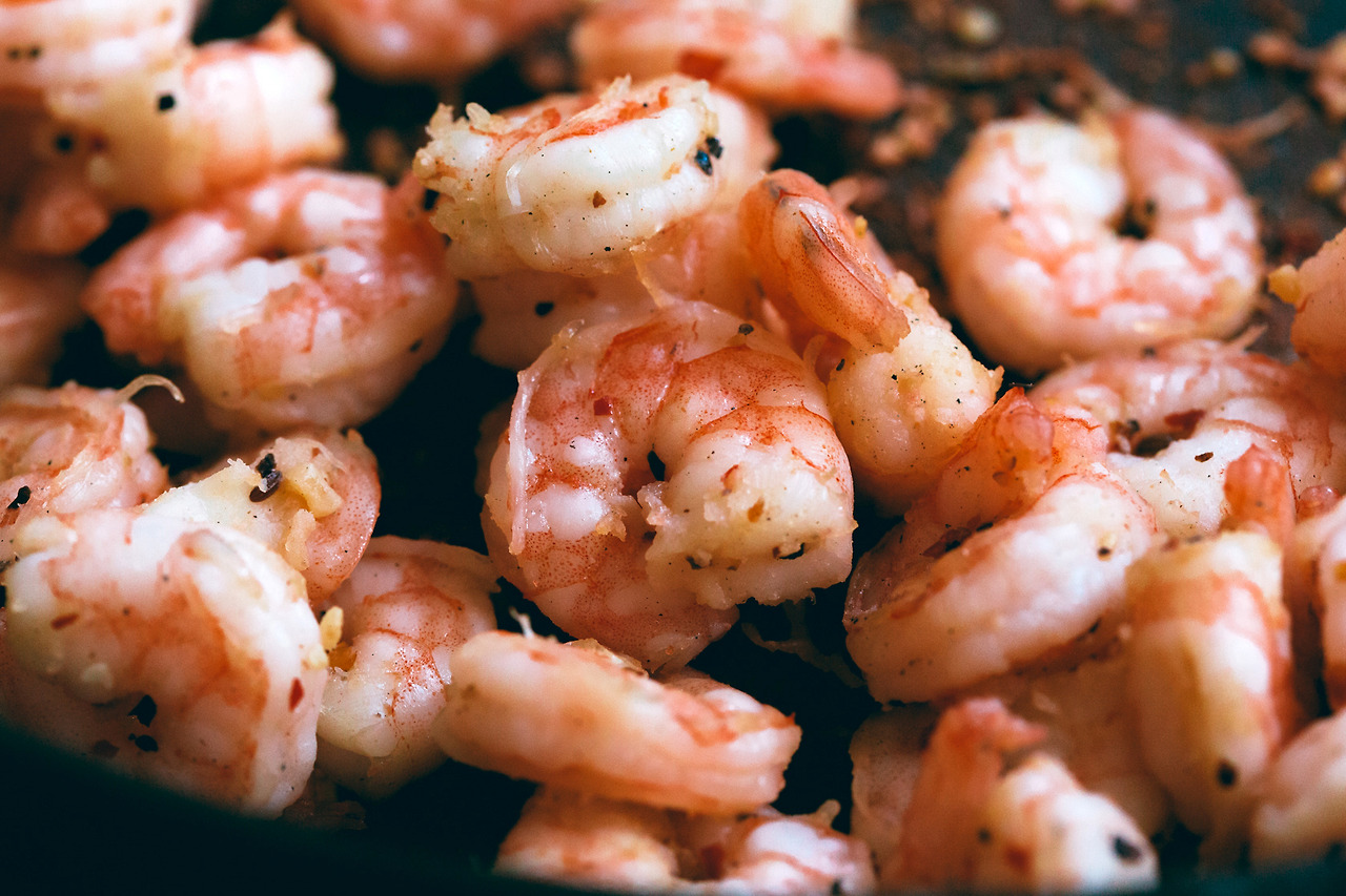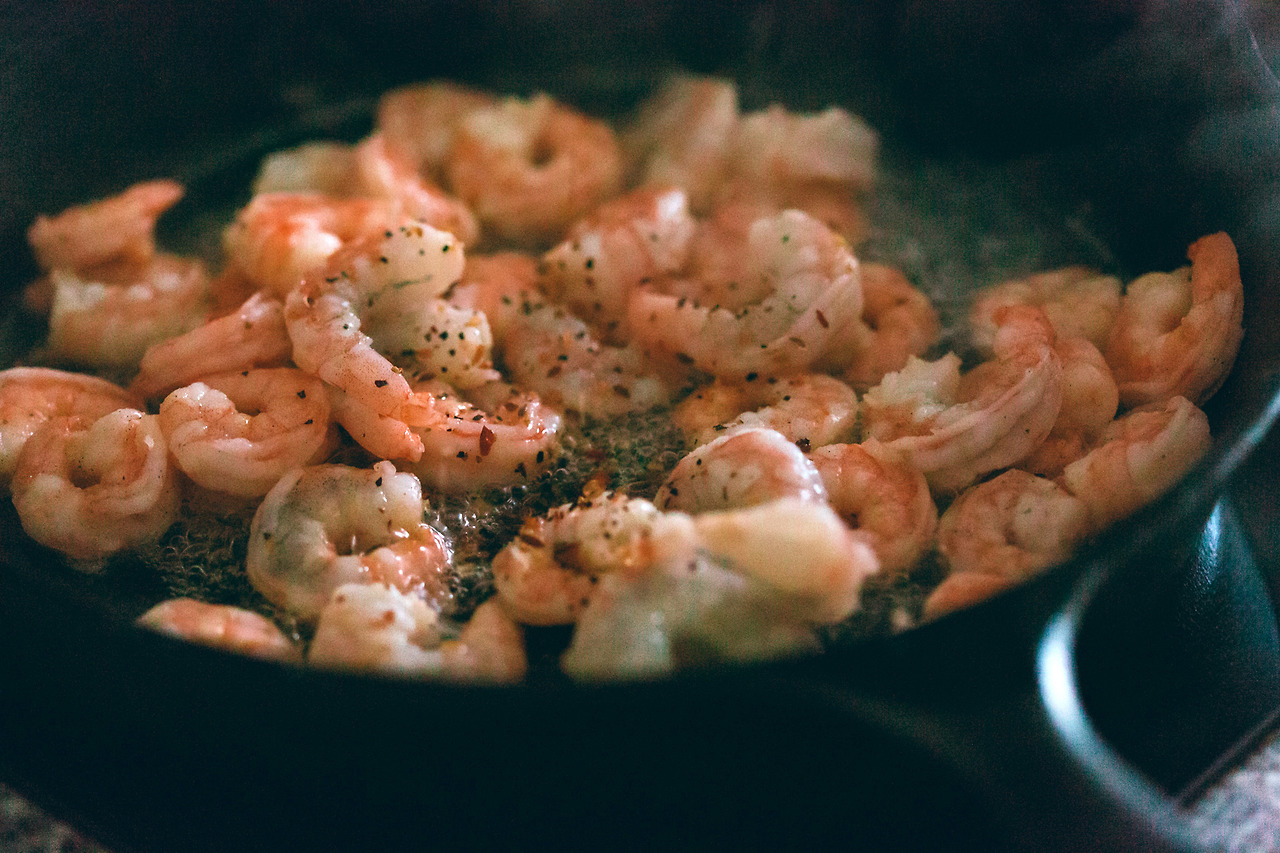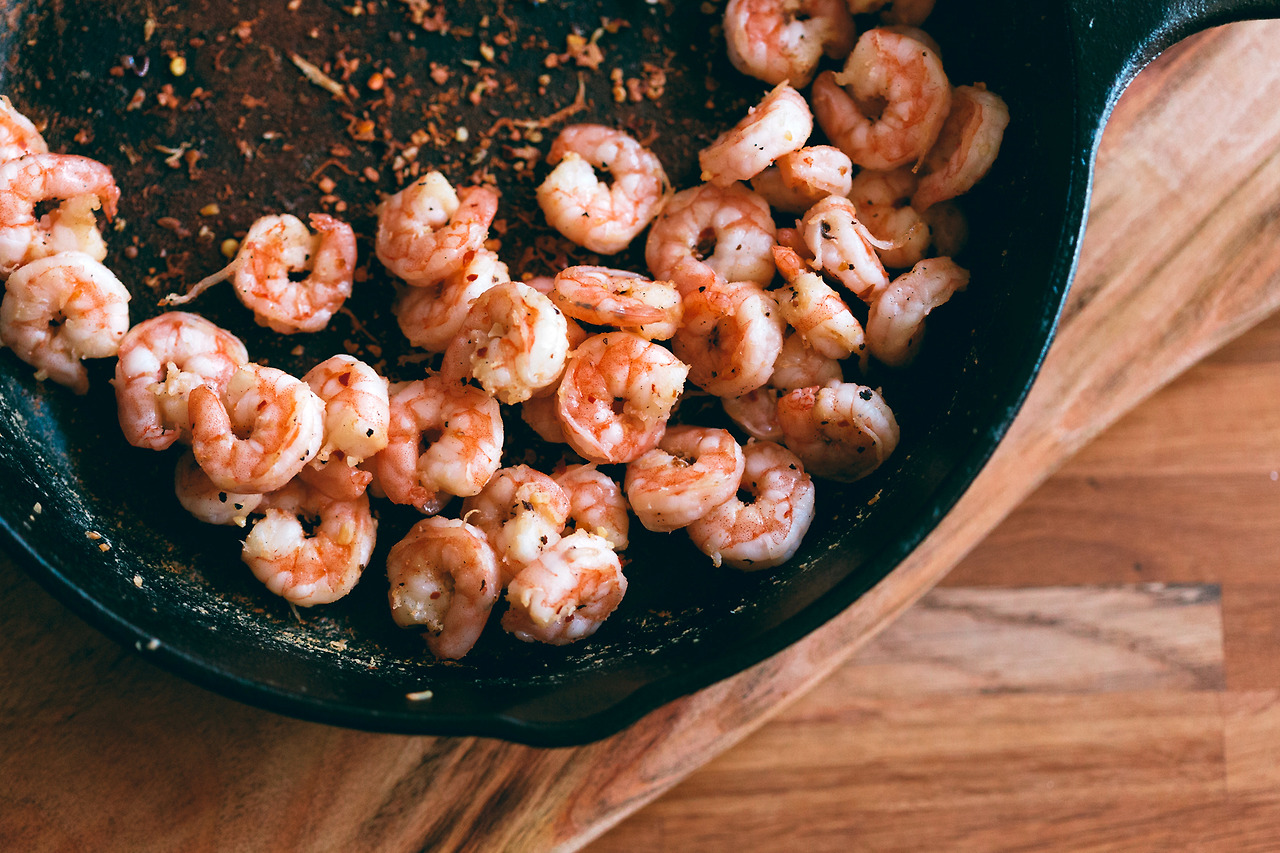 무쇠 팬에 시즈닝을 덧입은 새우를 살펴볼 차례. 탱글탱글한 새우살 사이로 각종 양념들이 춤을 추고 있다.