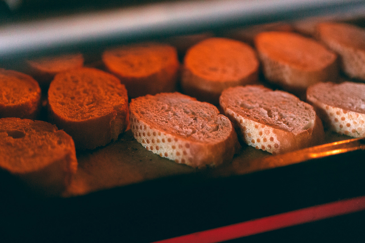 부르스케타로 만들 바게트 빵을 슬라이스해 오븐에서 바삭하게 구워내면 모든 준비 완료.