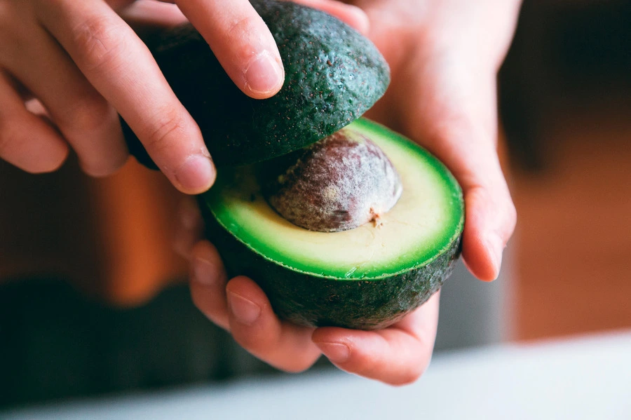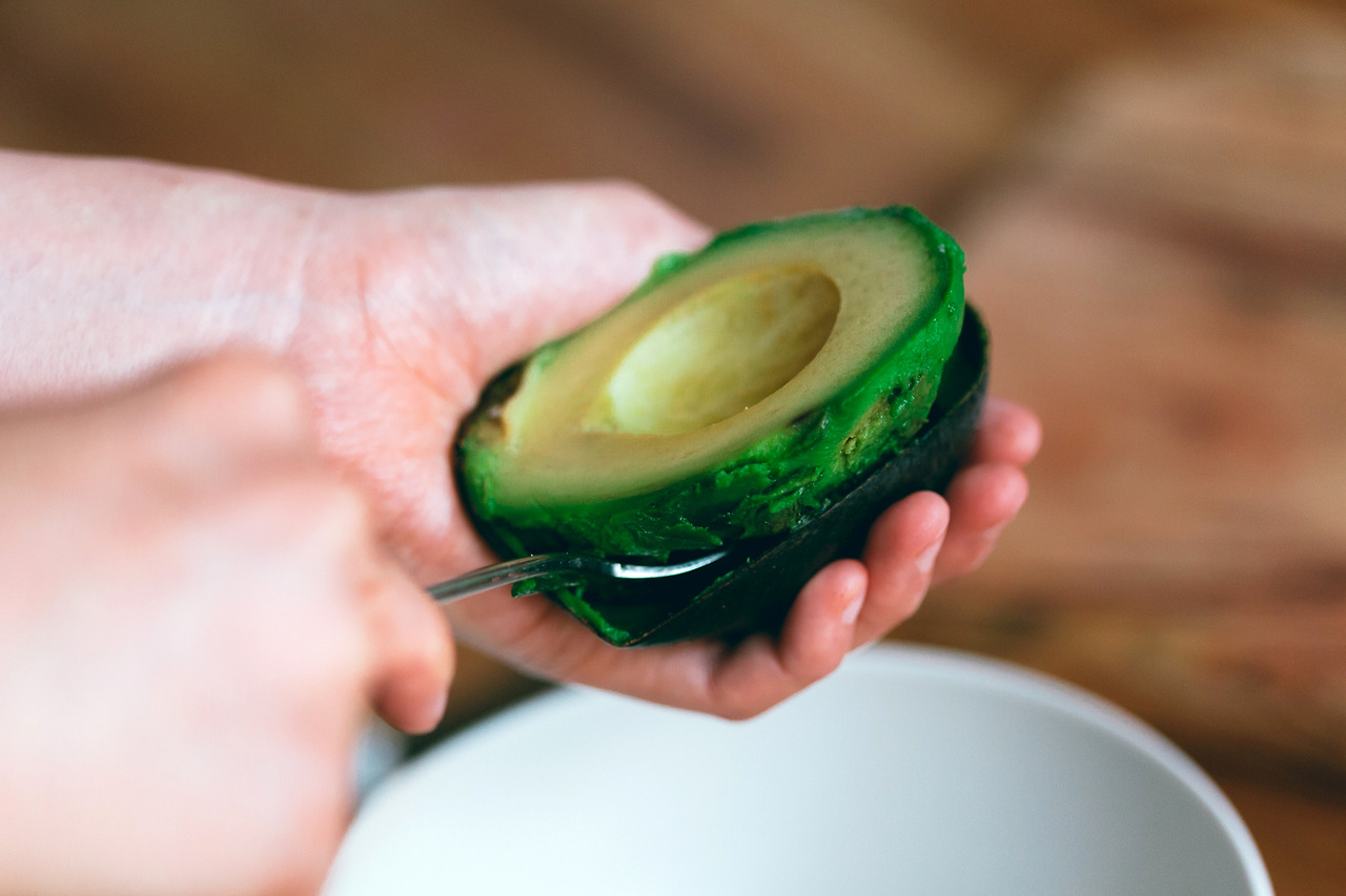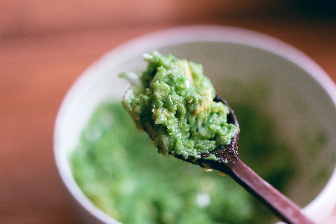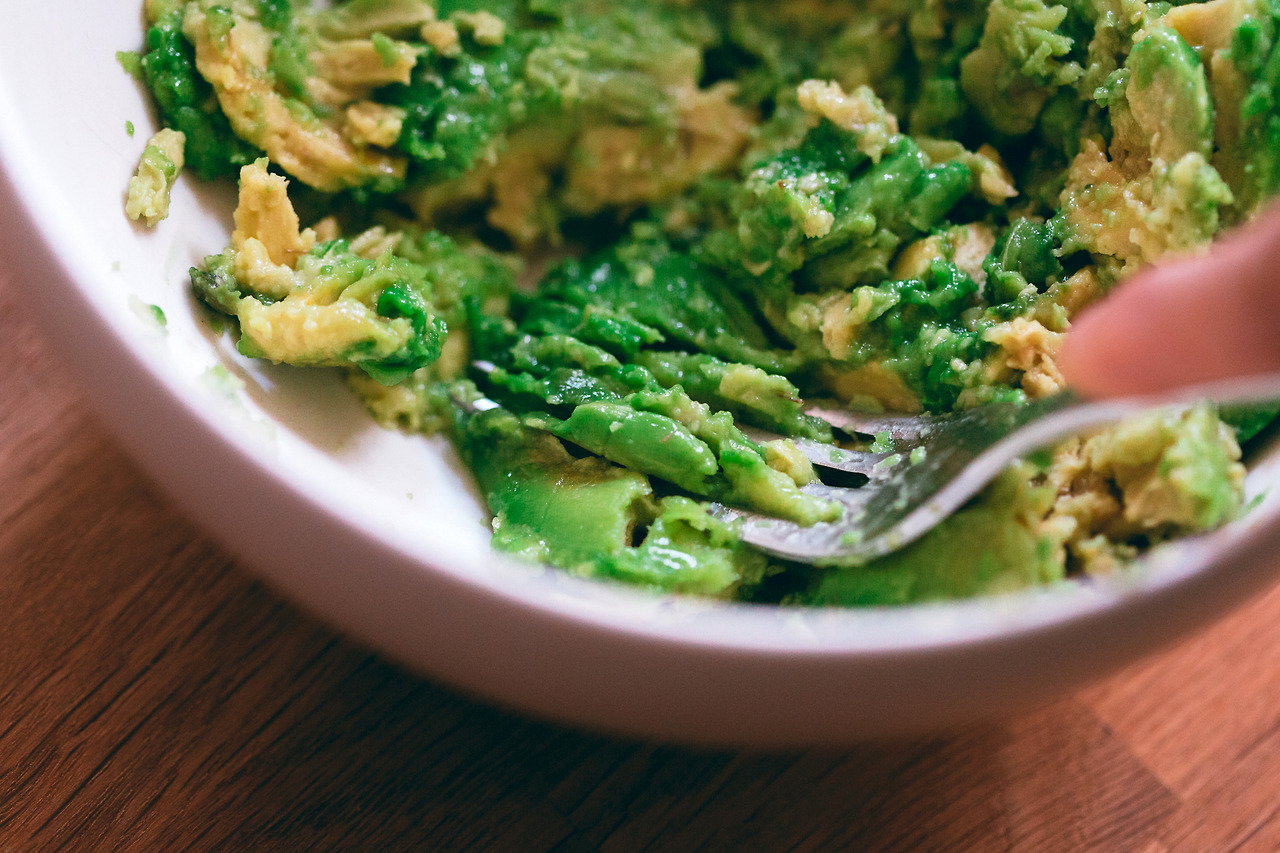 맛있게 익은 아보카도의 빛깔. 초록과 노랑의 환상적인 그라데이션. 간단하게 포크를 이용해 짓눌러 주기만 해도 잘 으깨진다.