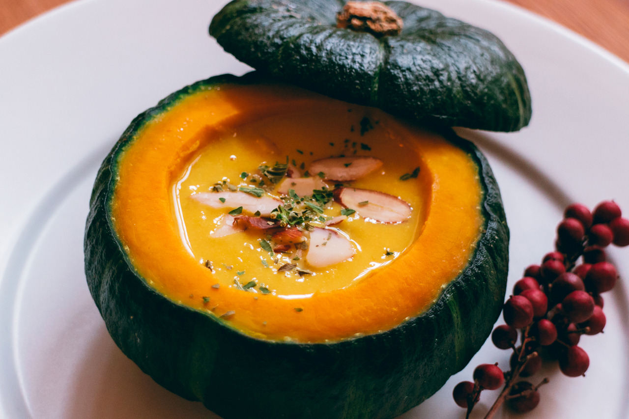 찜솥에 쪄낸 단호박 그릇 속으로 꿀 한 바퀴 두르고, 집중력을 발휘해 솥단지 안의 호박 스프를 담아낸다(접시 위로 스프가 방울지지 않도록). 아몬드와 파슬리 토핑, 겨울 속에서 빛나는 상록수 남천의 붉은 열매.