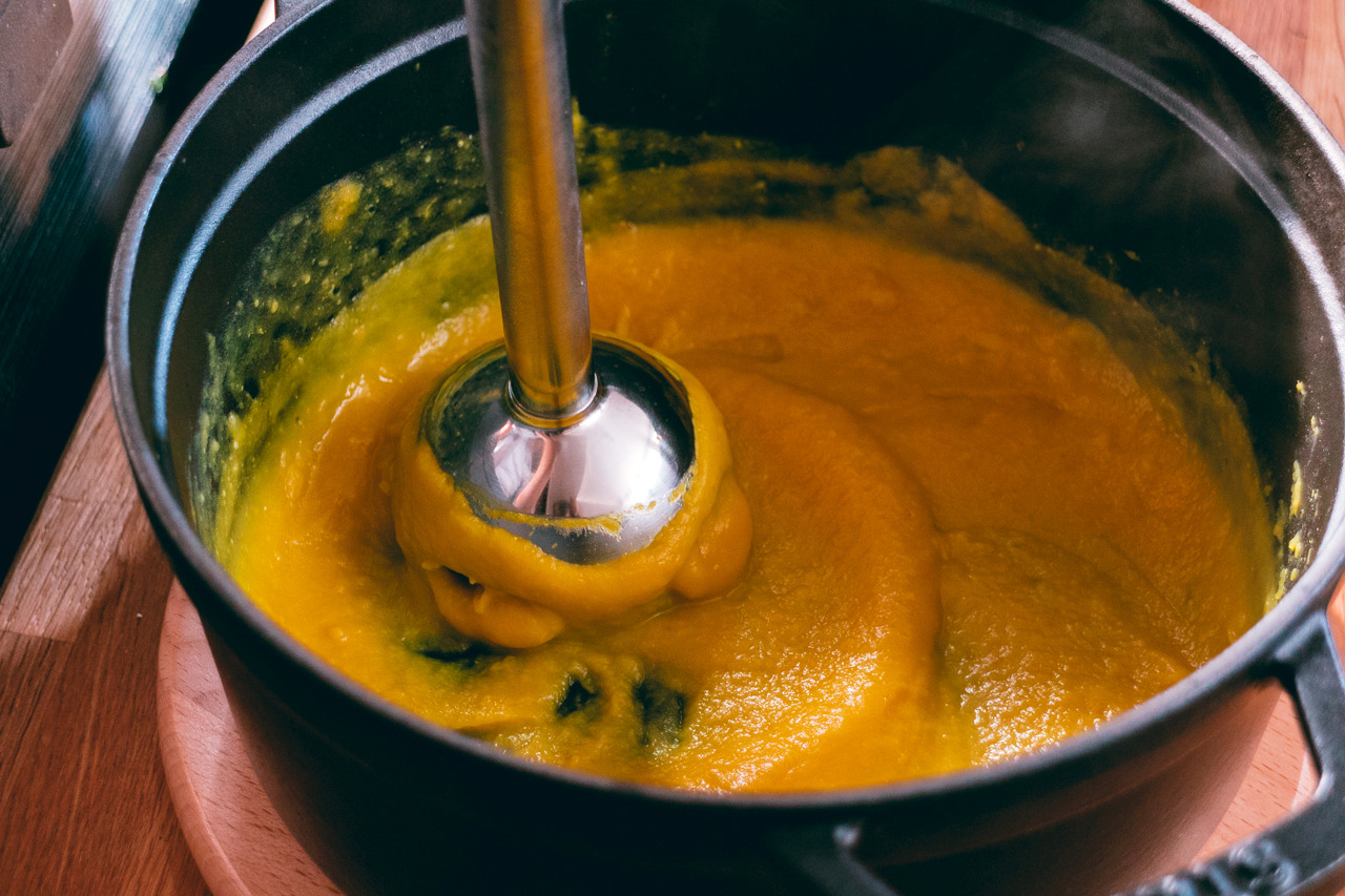 _ 호박이 부드럽게 으깨어질 정도로 푹 익으면 블랜더를 사용해 부드럽게 갈아준다.