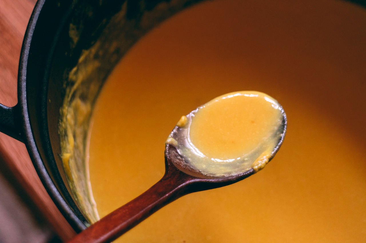 _ 맛있게 익은 호박을 꺼내 꿀을 한 바퀴 둘러 준 뒤 냄비의 호박 스프를 담아낸다.