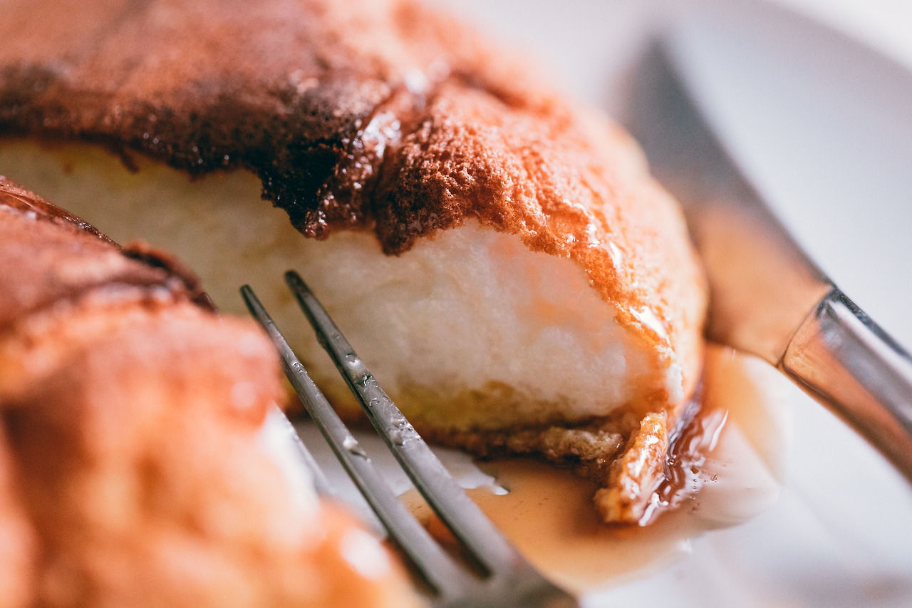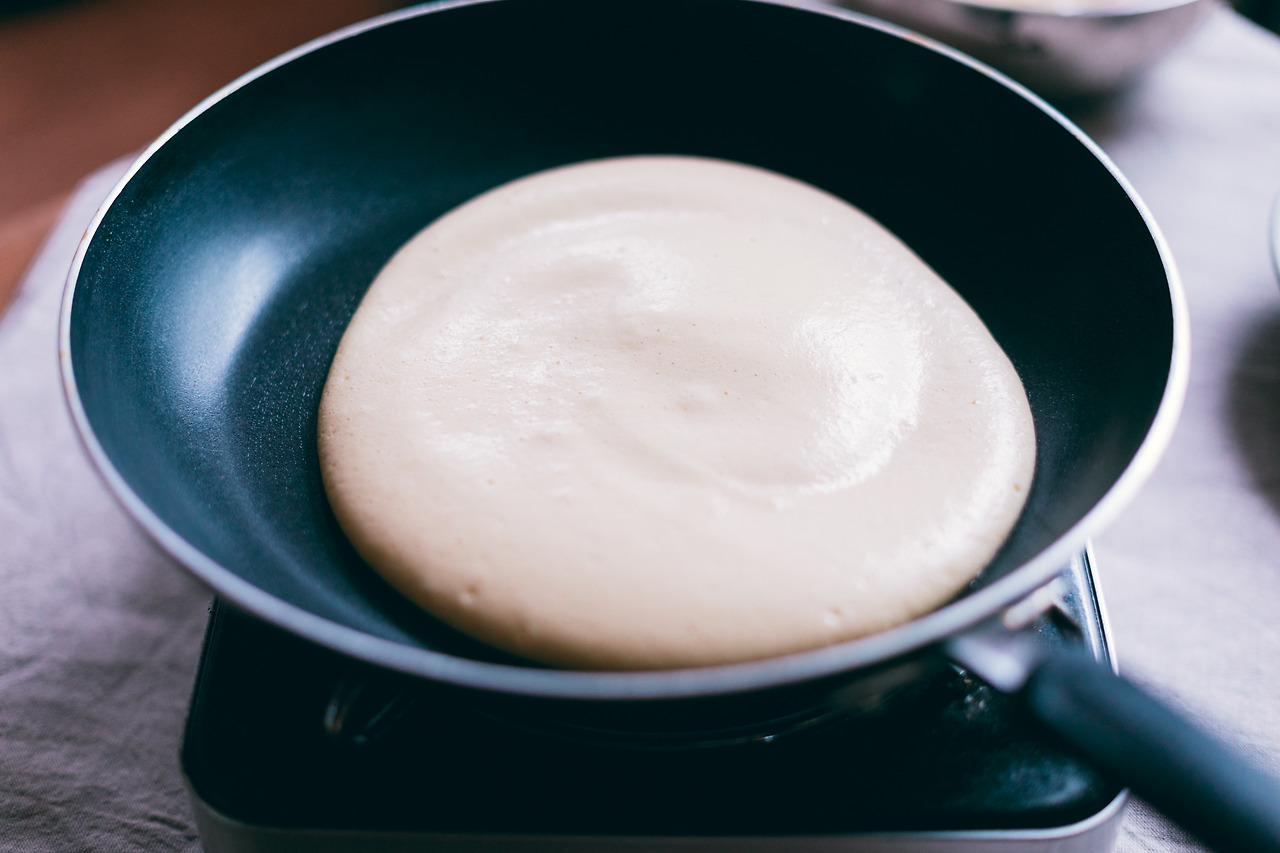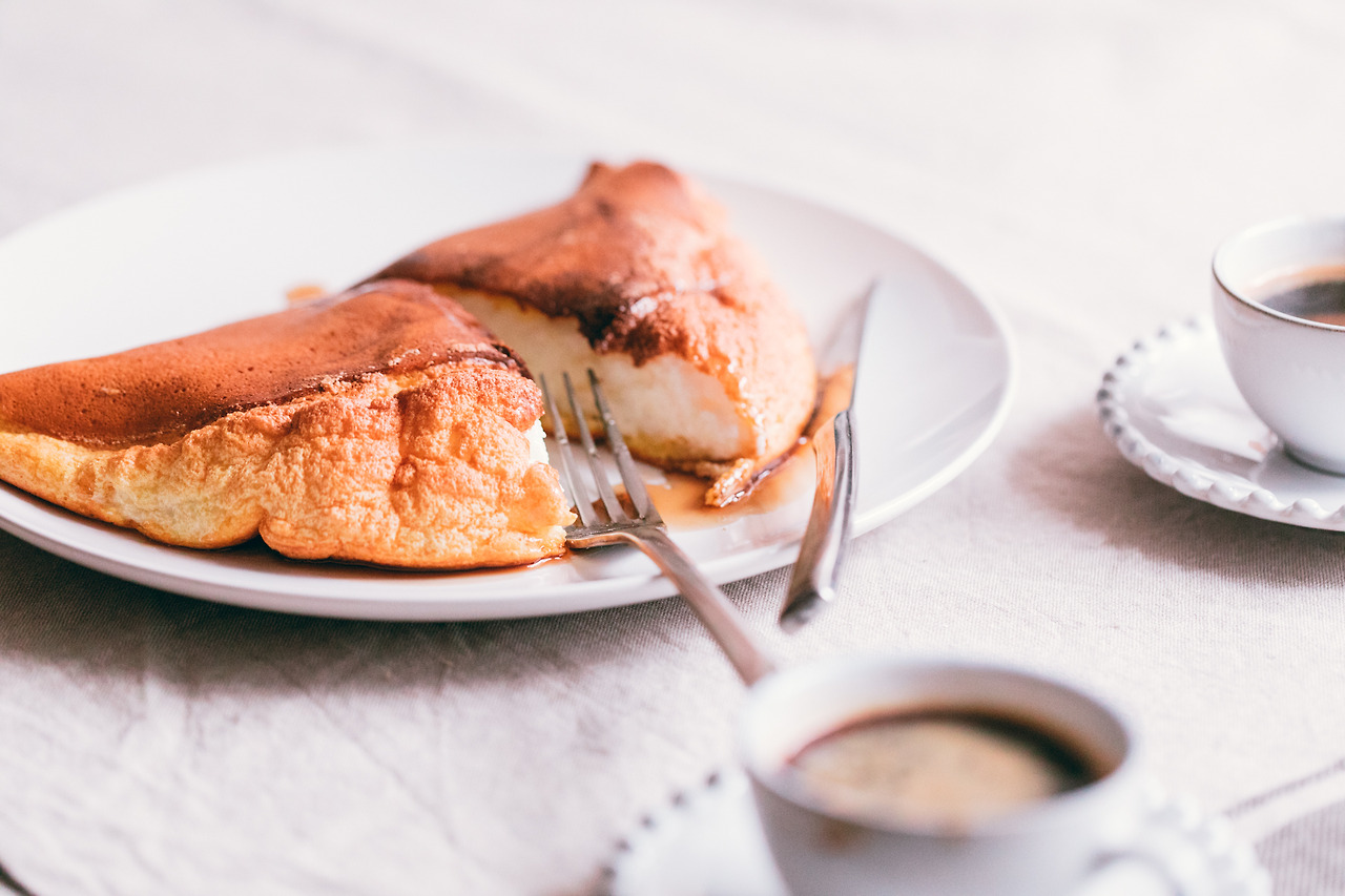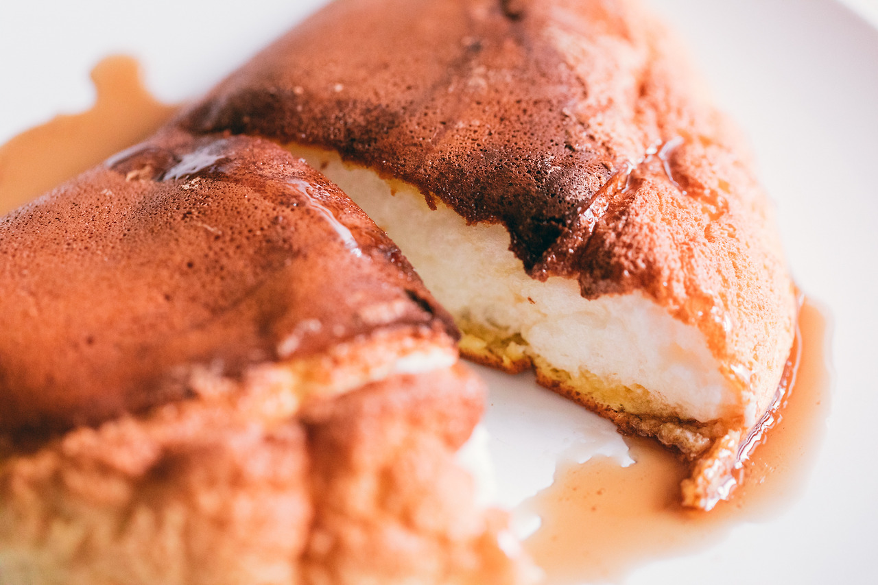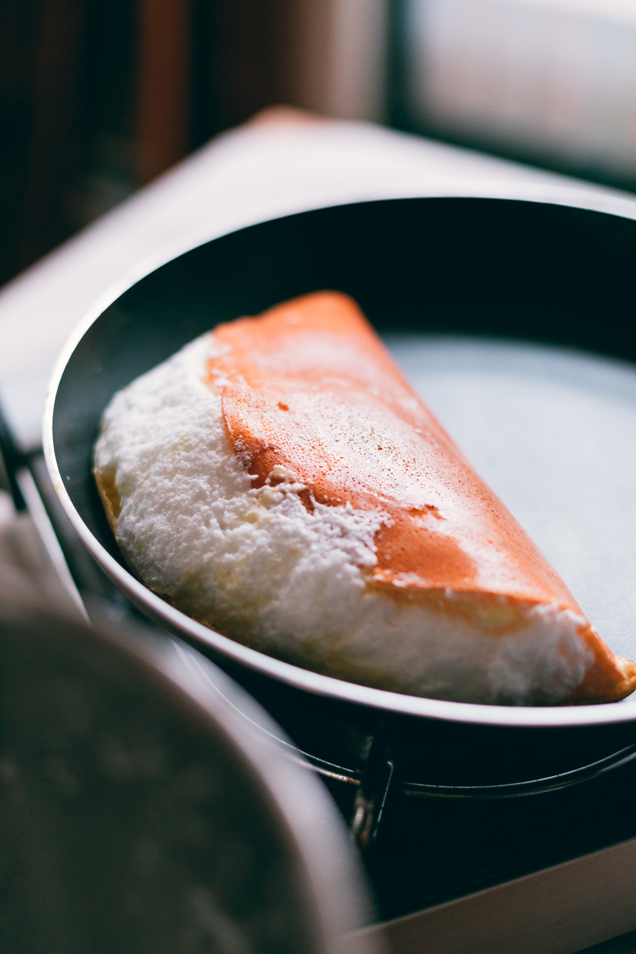 설익은 반죽 표면에 기포가 올라오면 남은 머랭을 올린다. 이때부터 불 조절의 미학이 빛을 발한다. 약불 유지가 포인트. 반을 접어 새하얀 머랭을 어루만지듯 감싸면 완성.