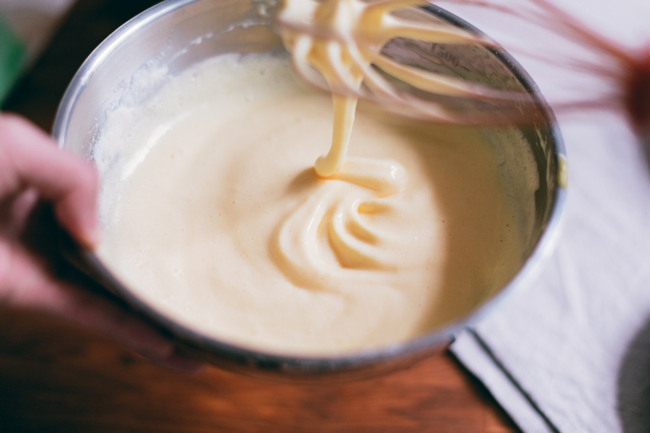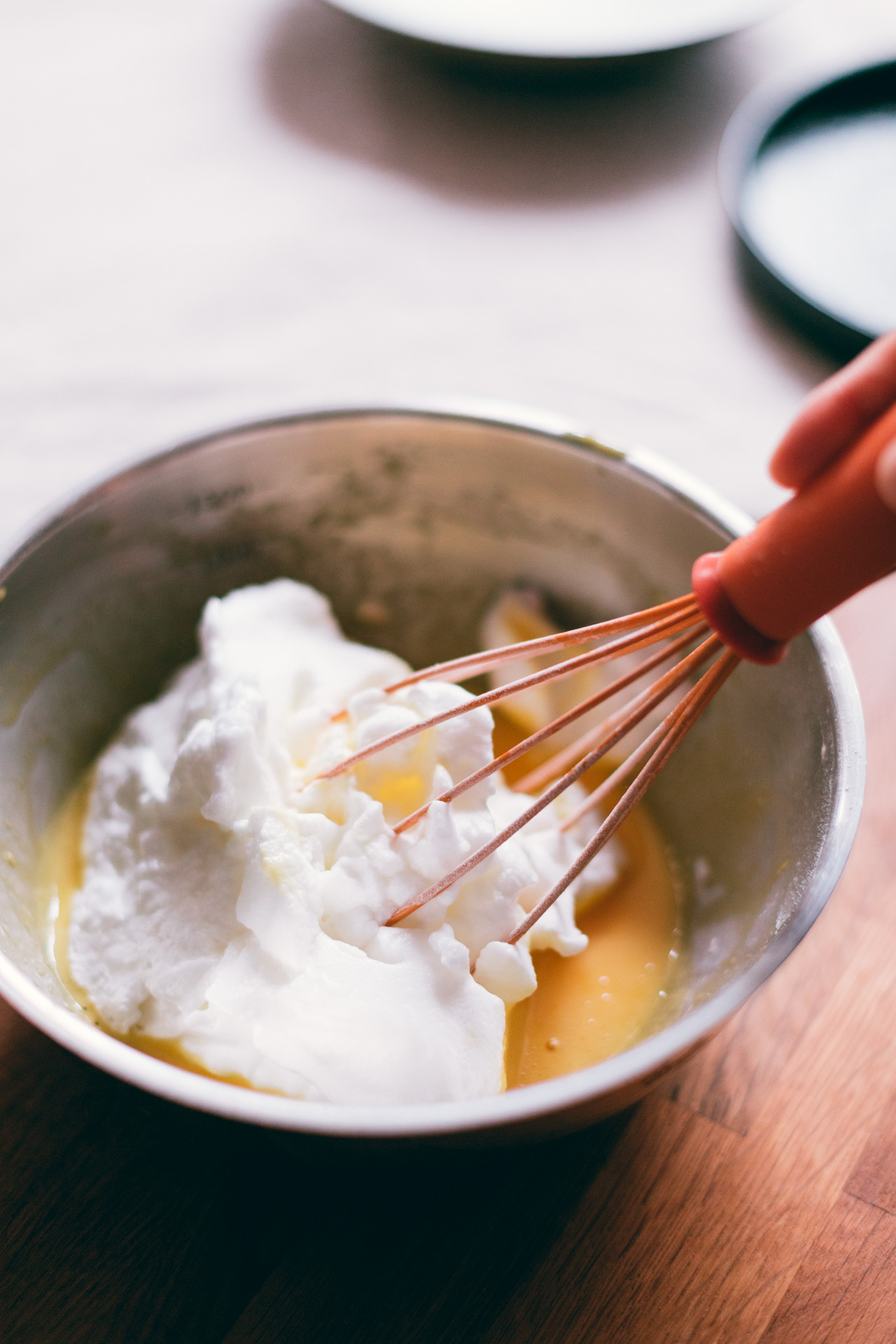휘핑한 노른자에 머랭을 섞어 반죽을 만든다.