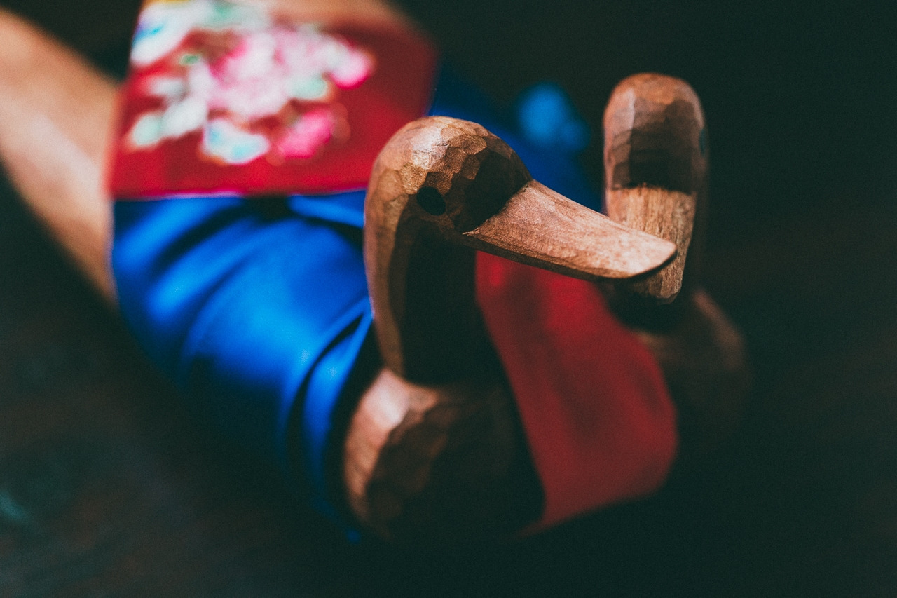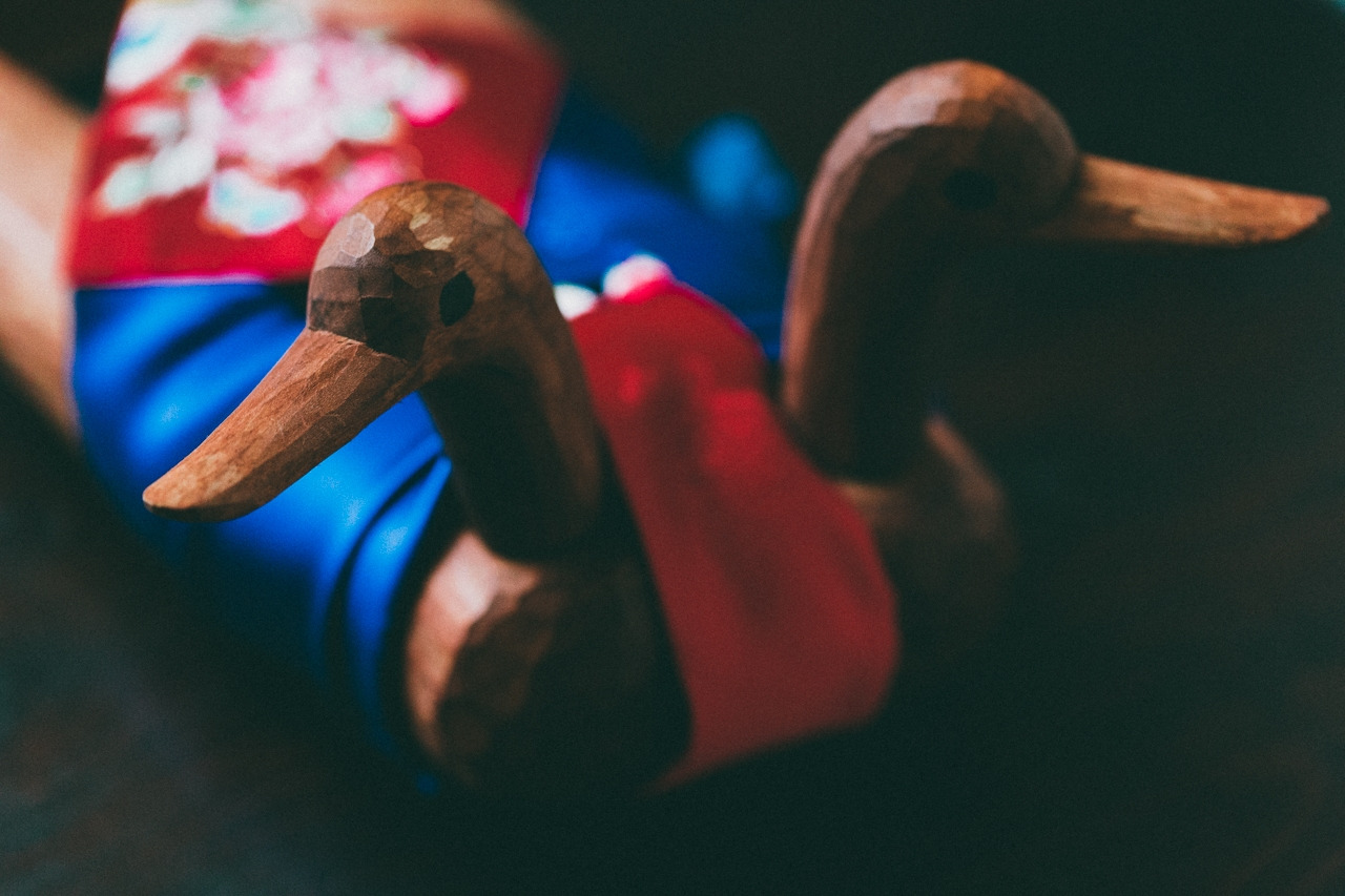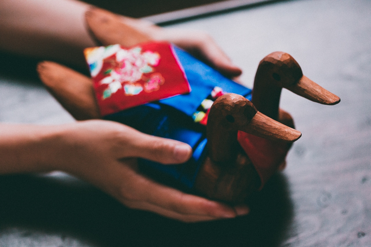 목안木雁이라 불리는 나무 기러기는 목이 돌아가도록 고정되어 있다. 일종의 사인이다. 기러기가 마주 보고 있으면 부부의 정이 돈독하고, 그 반대는 불화가 싹튼 것이라는 표식. 목안은 통나무 조각을 불에 그을려 수분을 제거하고 기본적인 형태를 다듬은 뒤 젖은 수건으로 까만 재를 닦아내 완성한다. 본래 나무 조각 보다 한결 가벼워진 기러기 한 쌍의 그을음과 입체적인 비정형의 나뭇결이 퍽 아름답게 느껴진다.