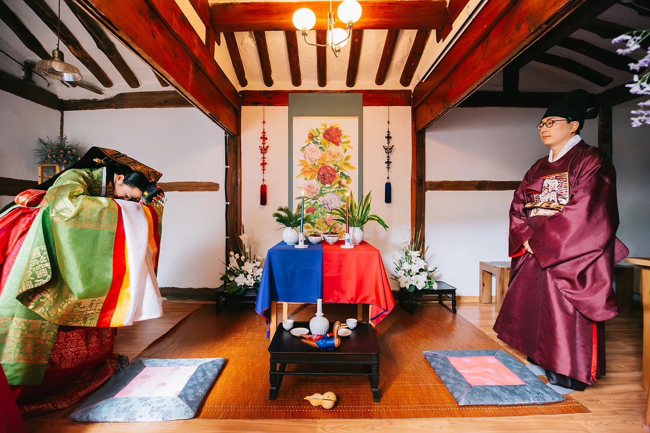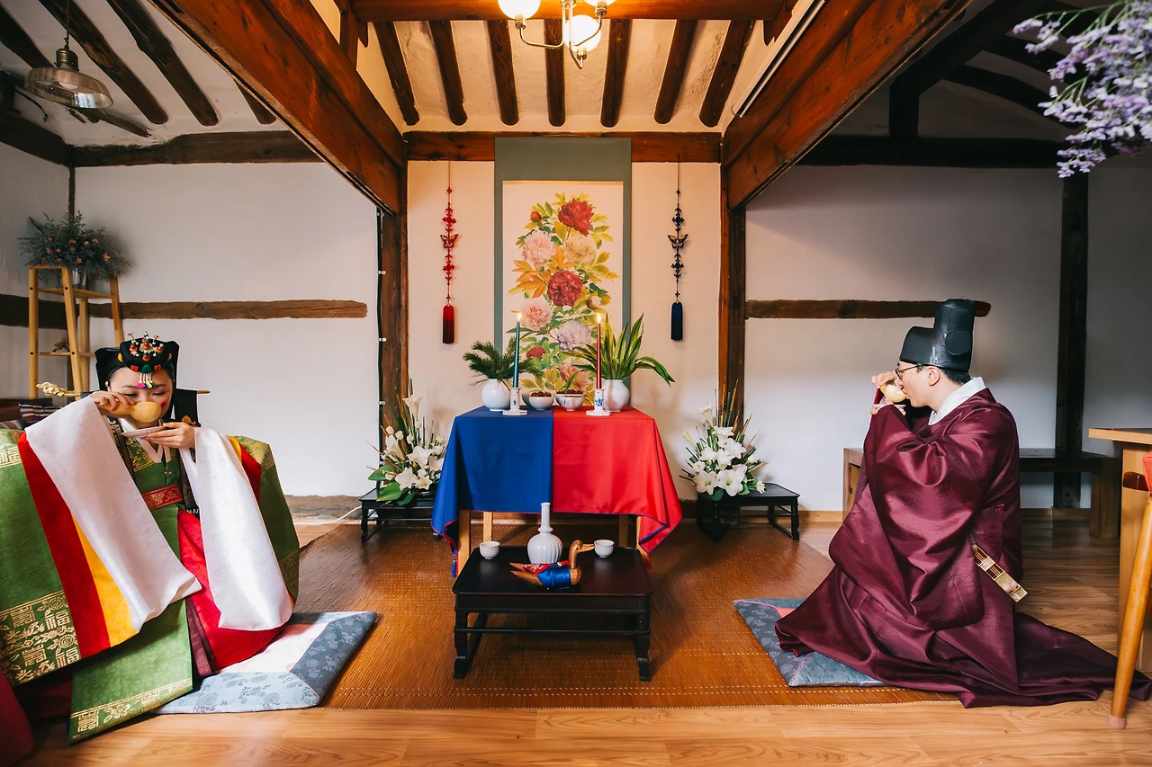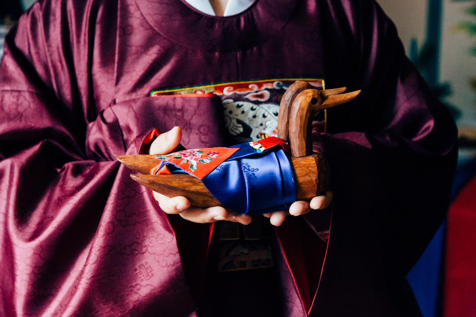 전통 혼례는 크게 세 가지 의식을 치른다. 신랑이 신부 어머니에게 기러기를 드리는 '전안례' , 신랑과 신부가 맞절하는 '교배례' , 신랑 신부가 한 쌍의 표주박에 술을 나눠 마시는 '합근례'.