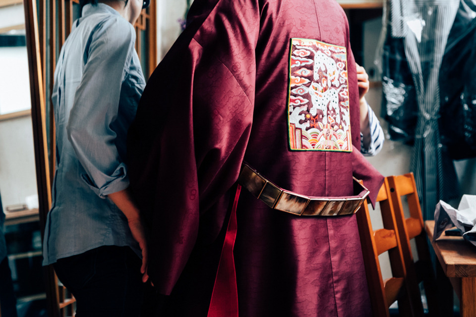 집에 돌아오니 신랑은 보라색 예복을 갖춰 입는 중이었다. 쌍호흉배가 달린 장색 단령의 혼례복은 과연 아름다웠다.