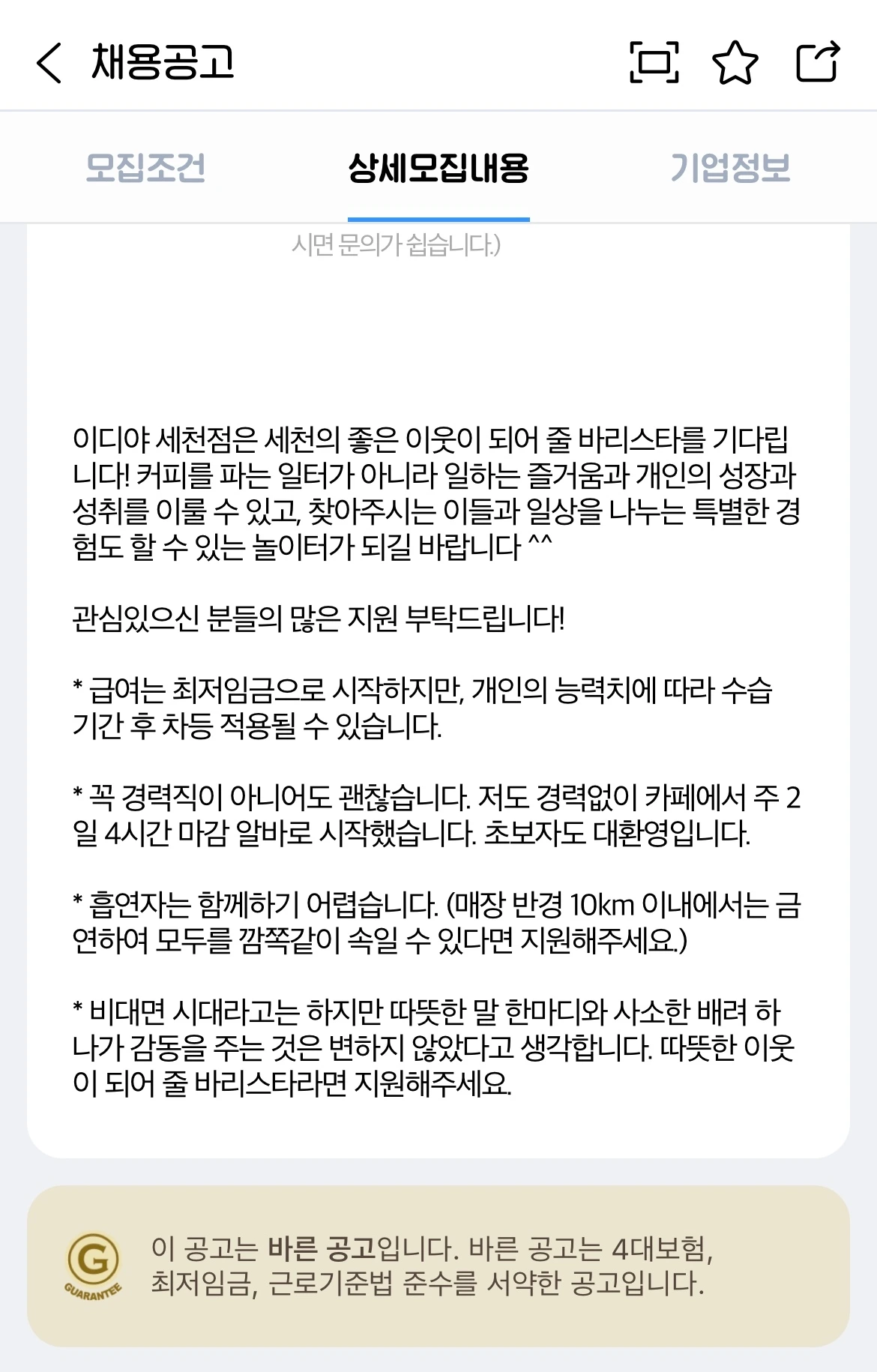 내가 동네 카페에서 2년 매니저로 일했을 때 일이다. 그땐 마스크도 안 쓸 때니 나의 얼굴이 고객들에게 고스란히 면대면될 때였다. 6개월 정도 일하니 동네 슈퍼만 가도 고객과 마주쳤고, 식당만 가도 옆 테이블에 고객의 가족들이 식사를 하고 있었다. 연예인까진 아니지만, '공인의 삶'이 이런 건가?라는 생각을 했다. 저 직원 카페에서는 엄청 친절하게 해 놓고, 사실은 아니잖아?라고 사람들이 실망할까 봐 바르게 행동하며 살아야겠다는 다짐도 했었다. 동네 장사하는 사람은 결국 동네 사람들에게 '좋은 이웃'이 되어야 된다고 생각했고, 이를 채용 공고에 그대로 쓴 것이다.