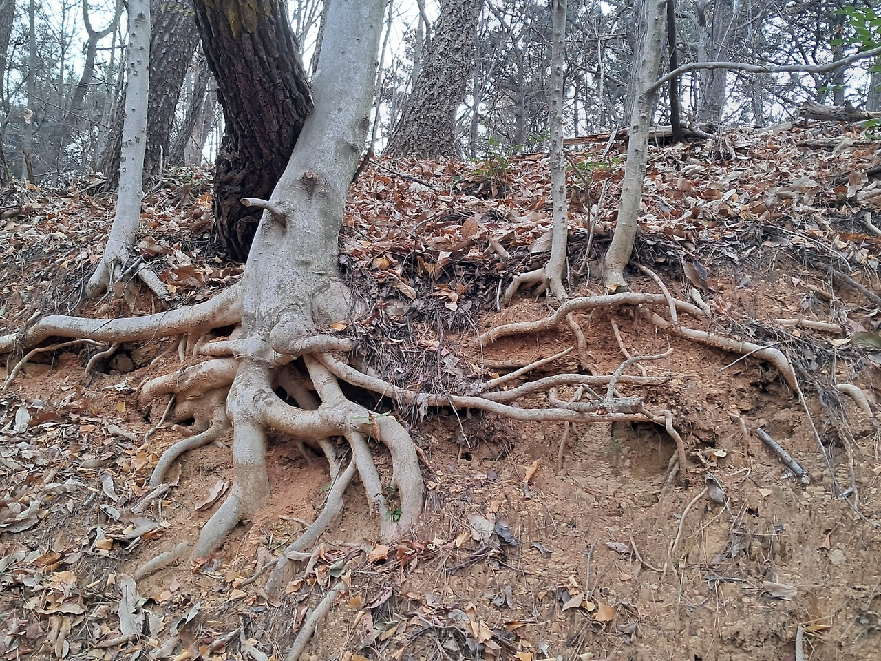 산길을 지나다 뿌리가 다 드러난 나무를 봅니다.