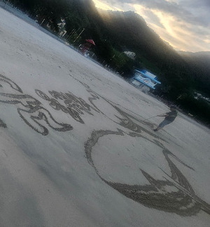 모래 속에 작별 인사 적어 넣는다