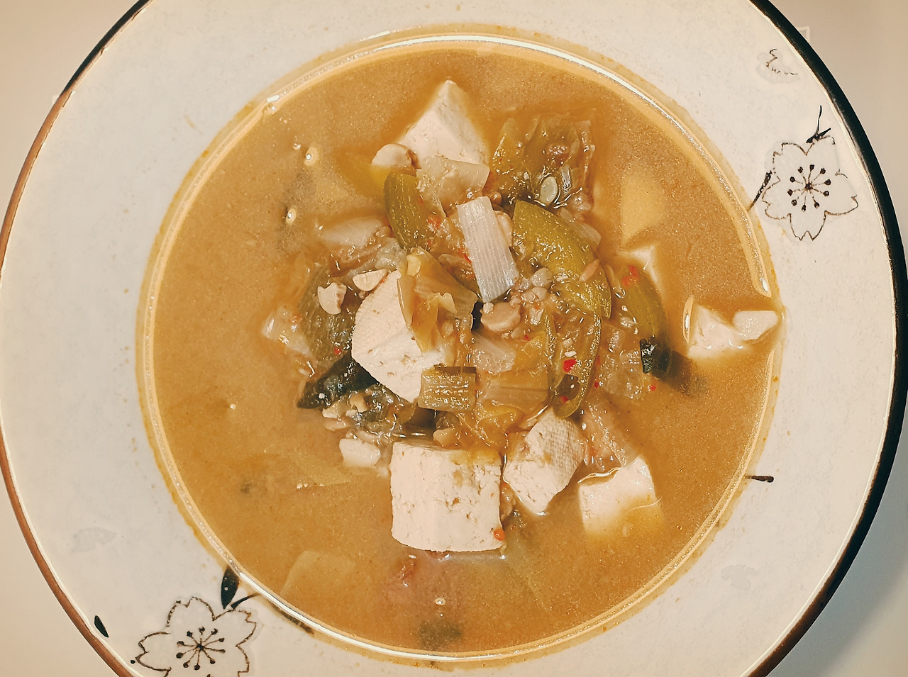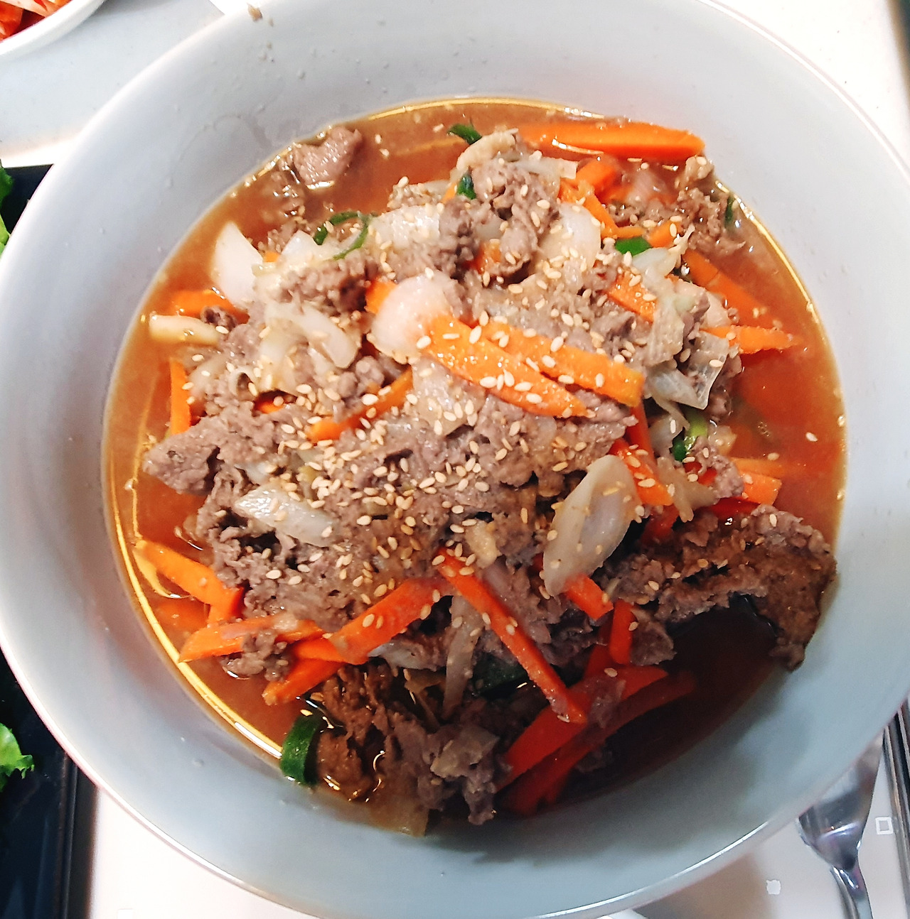 표고버섯 호박 당근 마늘 파 청양고추를 넣고 한 소금 끓였다. 차돌박이와 사골육수를 넣은 청국장은 맛이 깊었다.