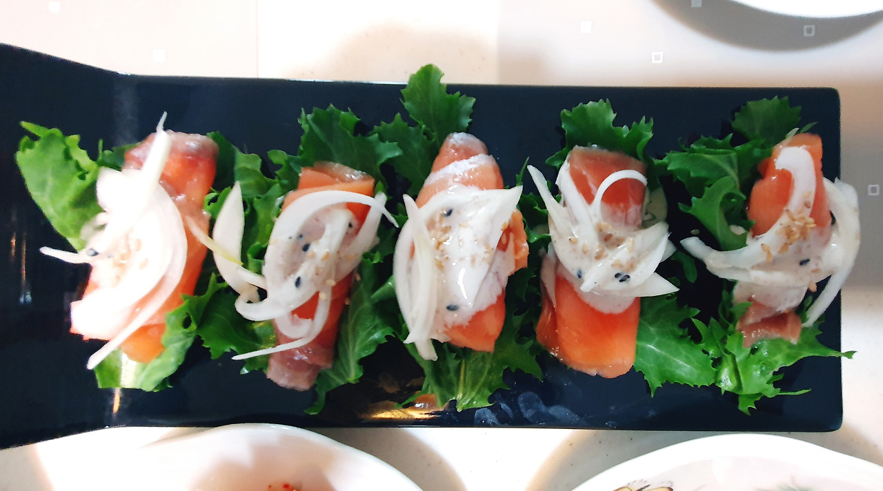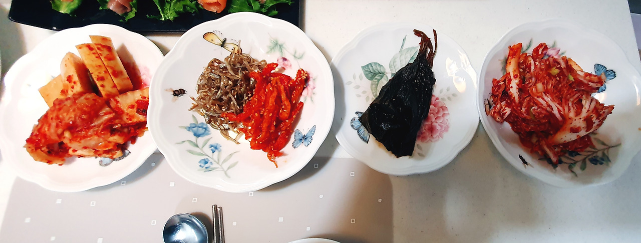 드디어 연어샐러드와 밑반찬과 김치가 어우러진 한국인의 밥상이 완성되었다.