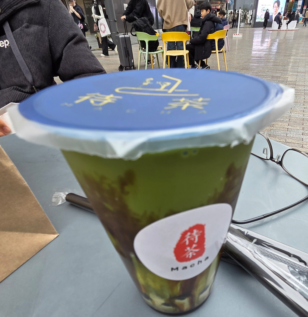 건물 속 벤치에 젤리와 커피 한 잔을 들고 앉으니
