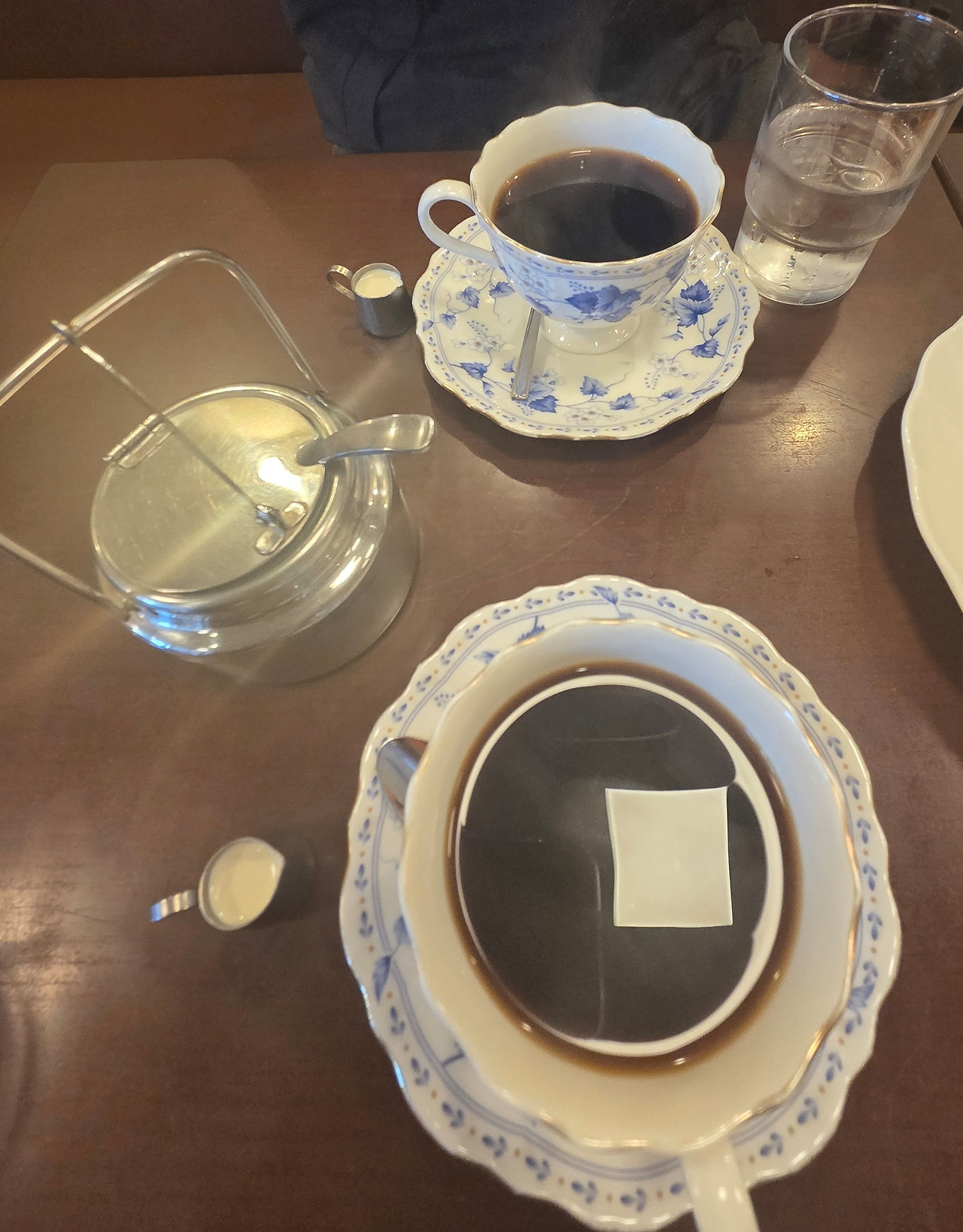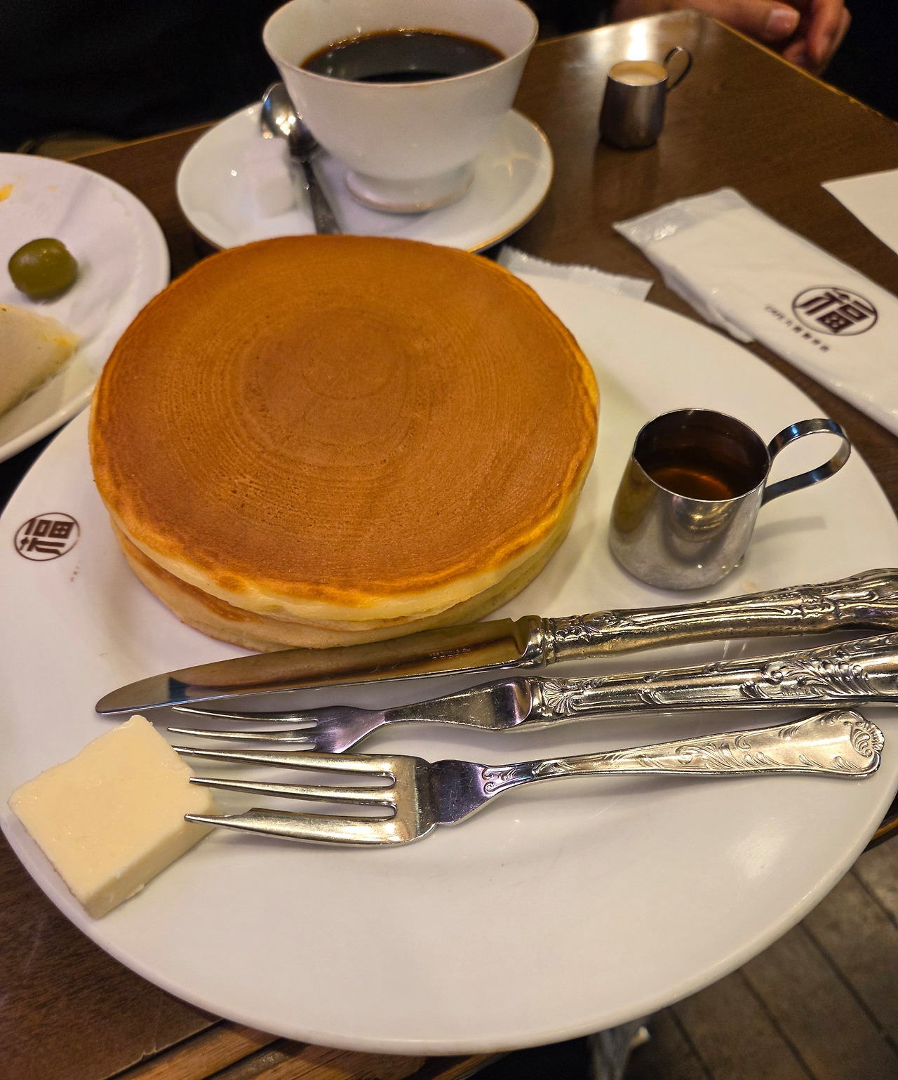 커피는 미지근했으며, 팬케이크는 살짝 퍽퍽했다.
