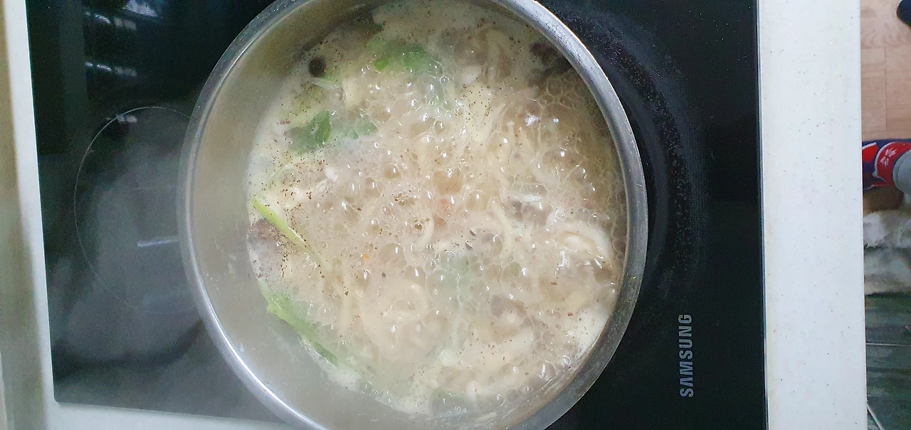 나만의 레시피(칼국수)-황태와 멸치로 국물 우려내기-칼국수 먼저 야채 넣고 끓이기-버섯 들깨 넣고 국간장으로 간하기-파 마늘로 마무리(감자전)-감자를 강판에 갈기-부침가루 넣기(부쳐 질정도로 너무 되지 않게)