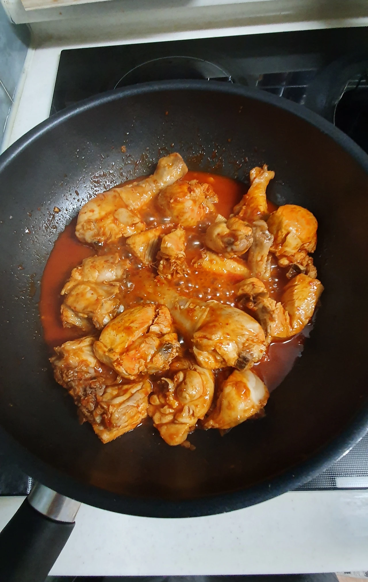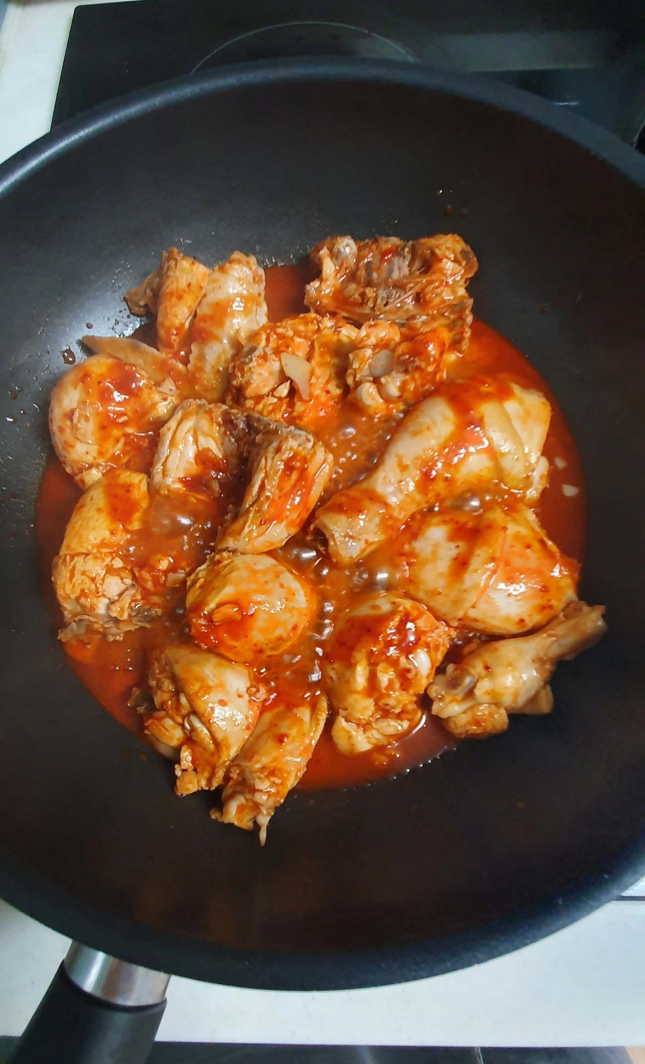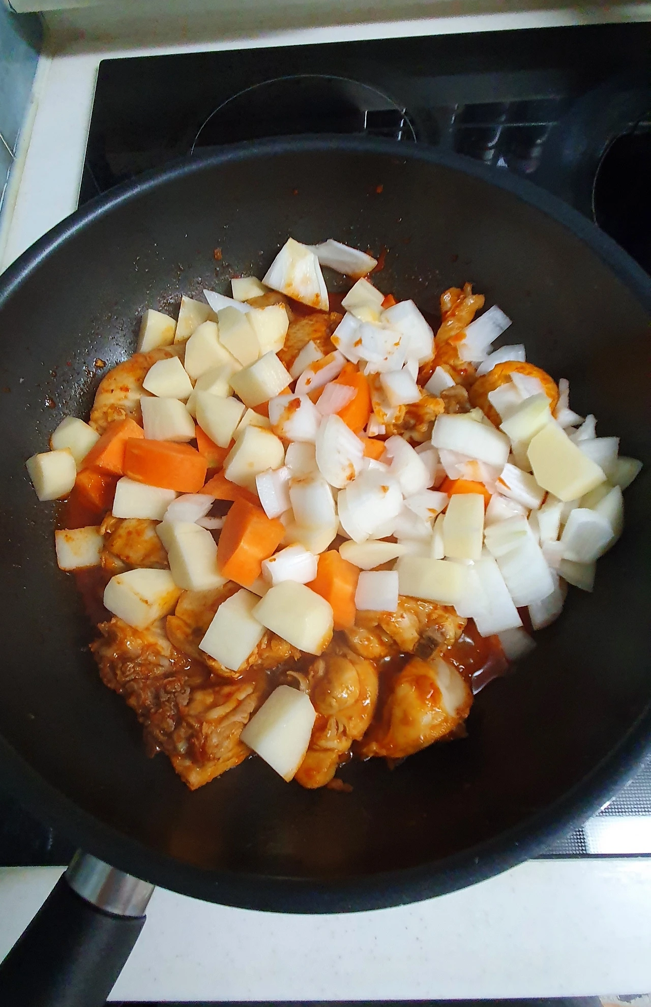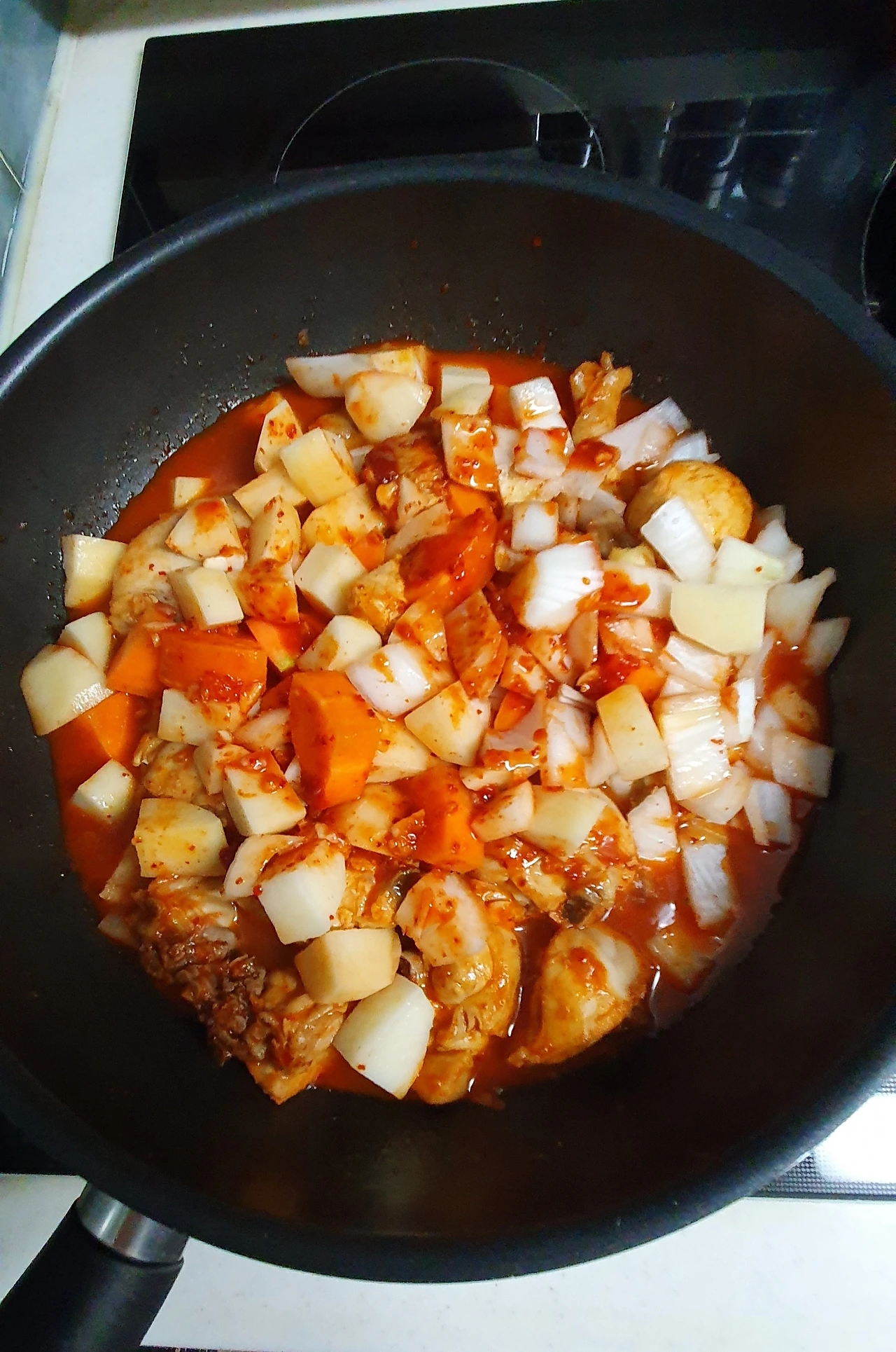(닭이 어느 정도 조려지면 야채와 나머지 양념을 넣고 조린다. 잘 익을 때까지. 대략 20분쯤)