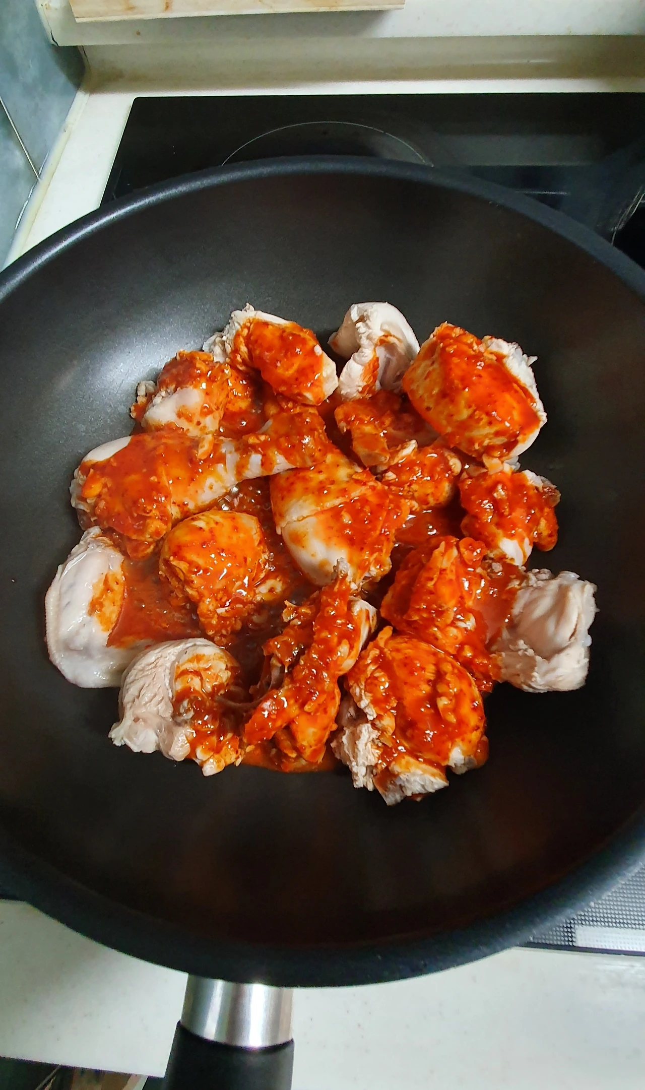 -닭을 먼저 고추장 양념(반)을 넣고