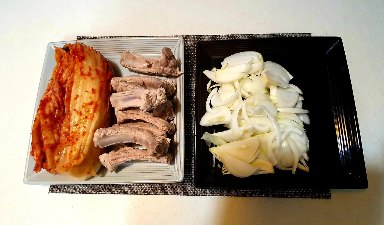 재료 준비;김치, 등갈비, 양파, 황태 우려낸 국물