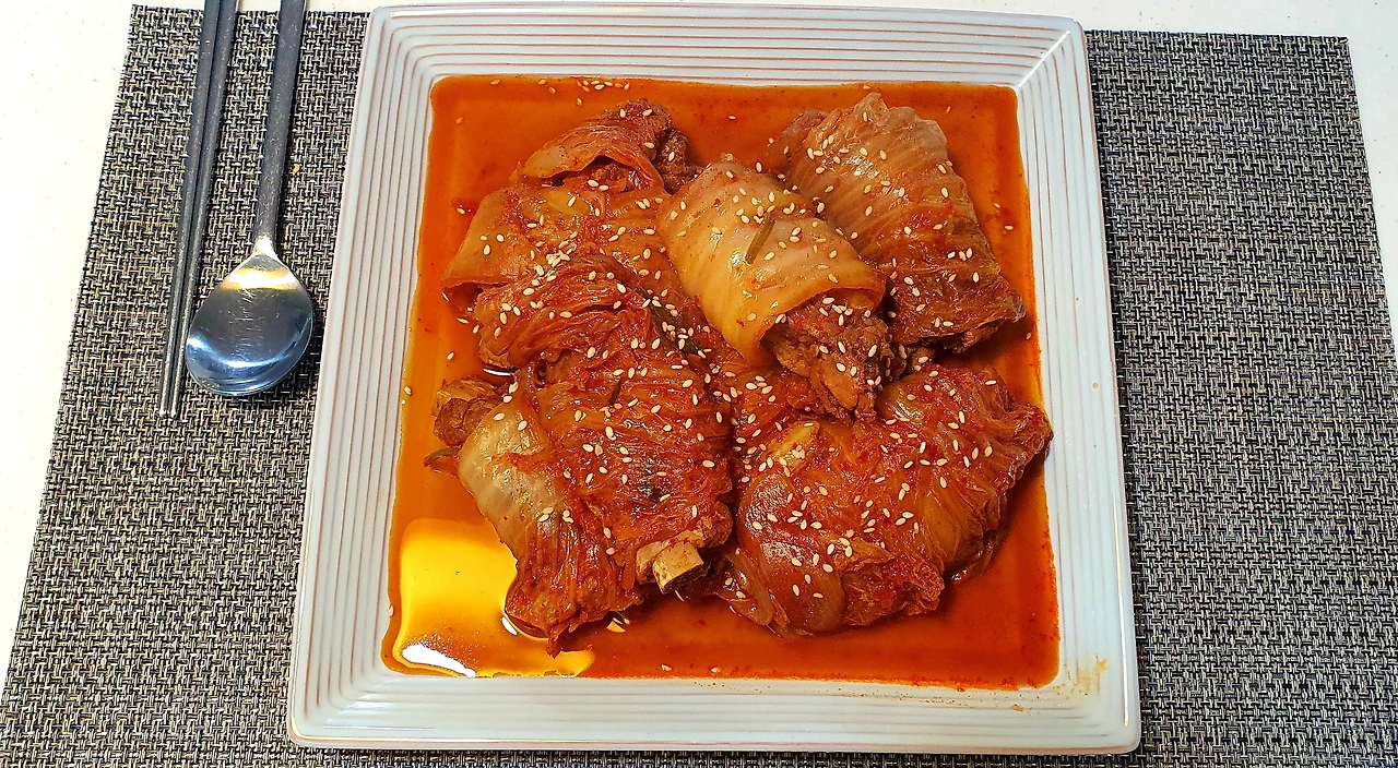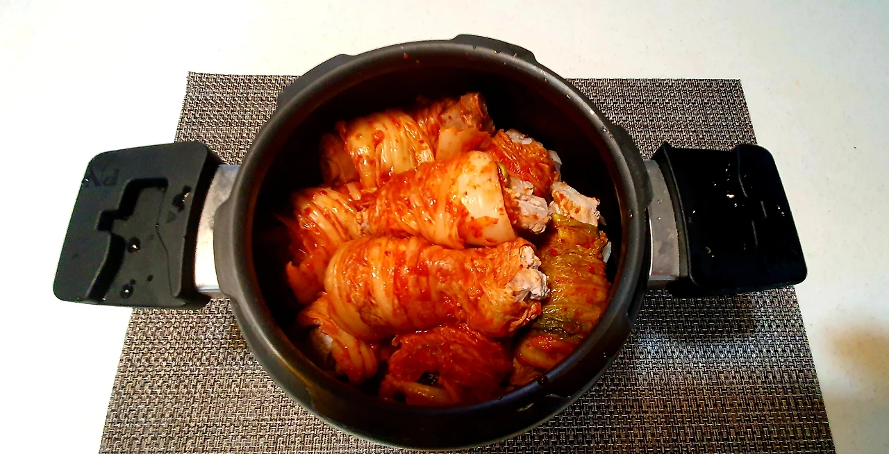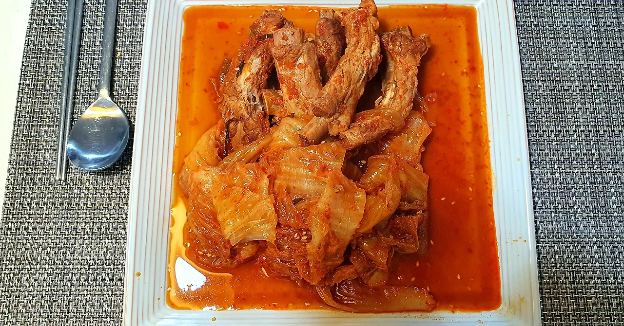 나만의 레시피;-등갈비의 핏물을 뺀다(한 시간쯤)-생강가루를 넣고 등갈비 삶아내기 그리고 깨끗이 씻어 불순물 제거하기-등갈비에 김치를 하나씩 말기-압력솥에 채 썬 양파 넣고 말아 놓은 등갈비 넣기-황태 국물 넣기-15분 정도 압력솥에 끓여서 천천히 김빼기