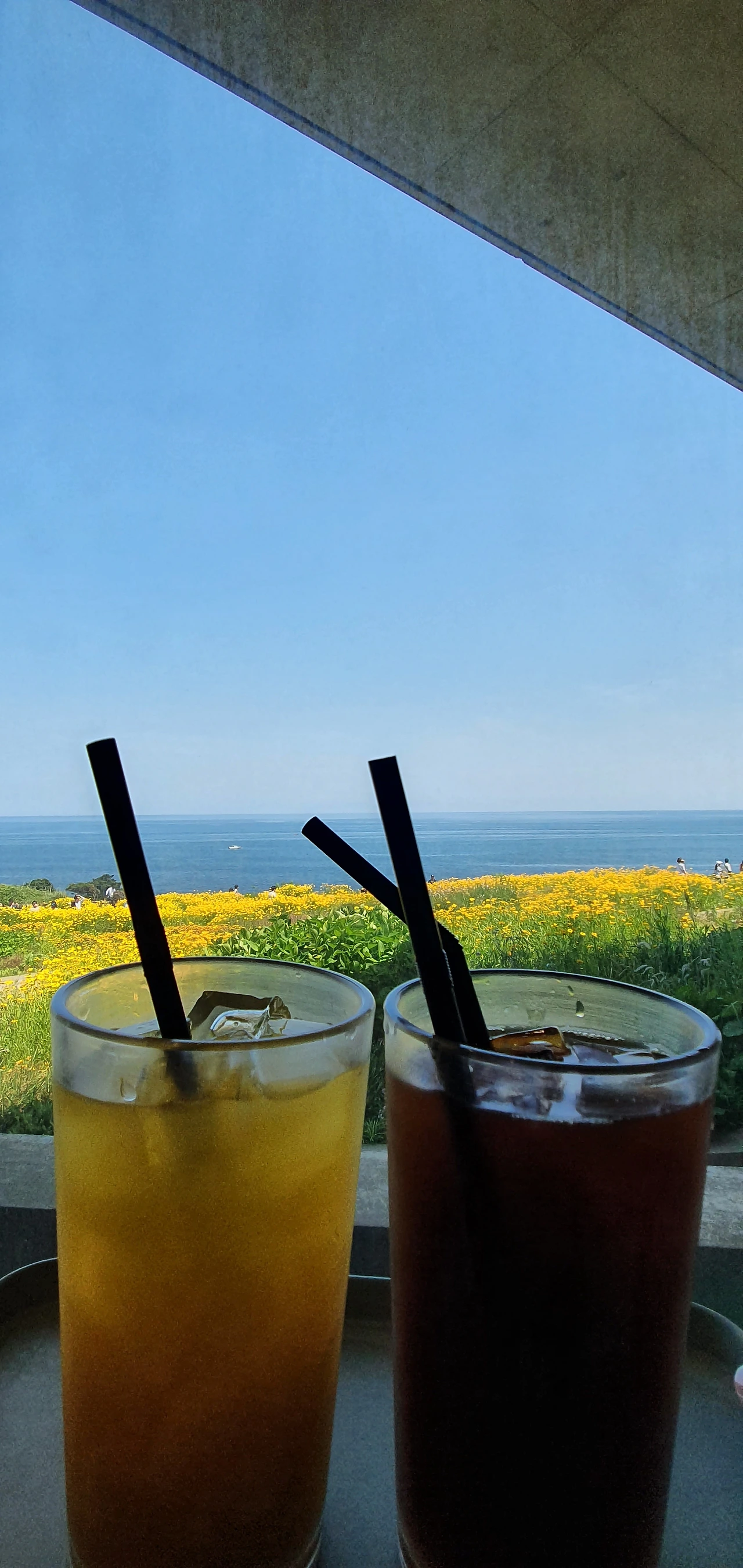 섭지코지의 끝자락엔 쉬어갈 수 있는 넓은 카페가 있다. 유채꽃은 아니지만 노란 꽃들과 바다가 어우러져 한동안 멍 때리며 바깥 풍경을 감상할 수 있었다. 인생도 여행도 언제나 쉼이 필요한것 같다.