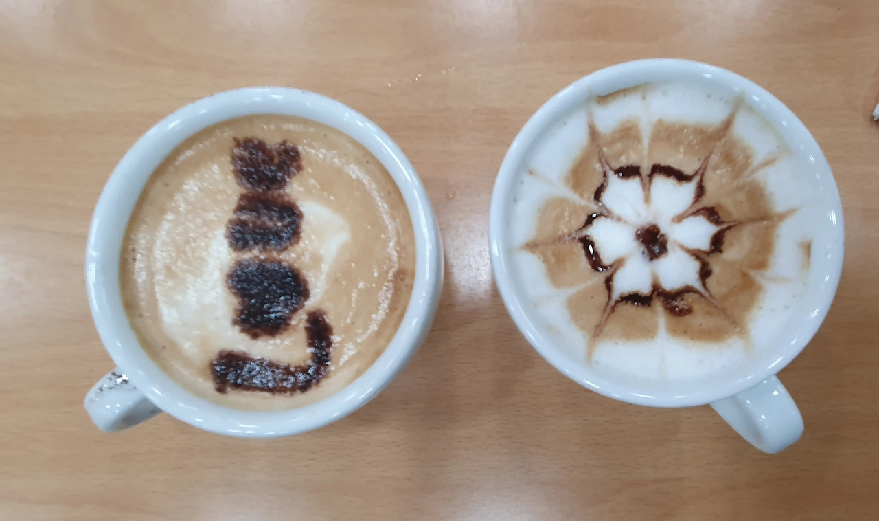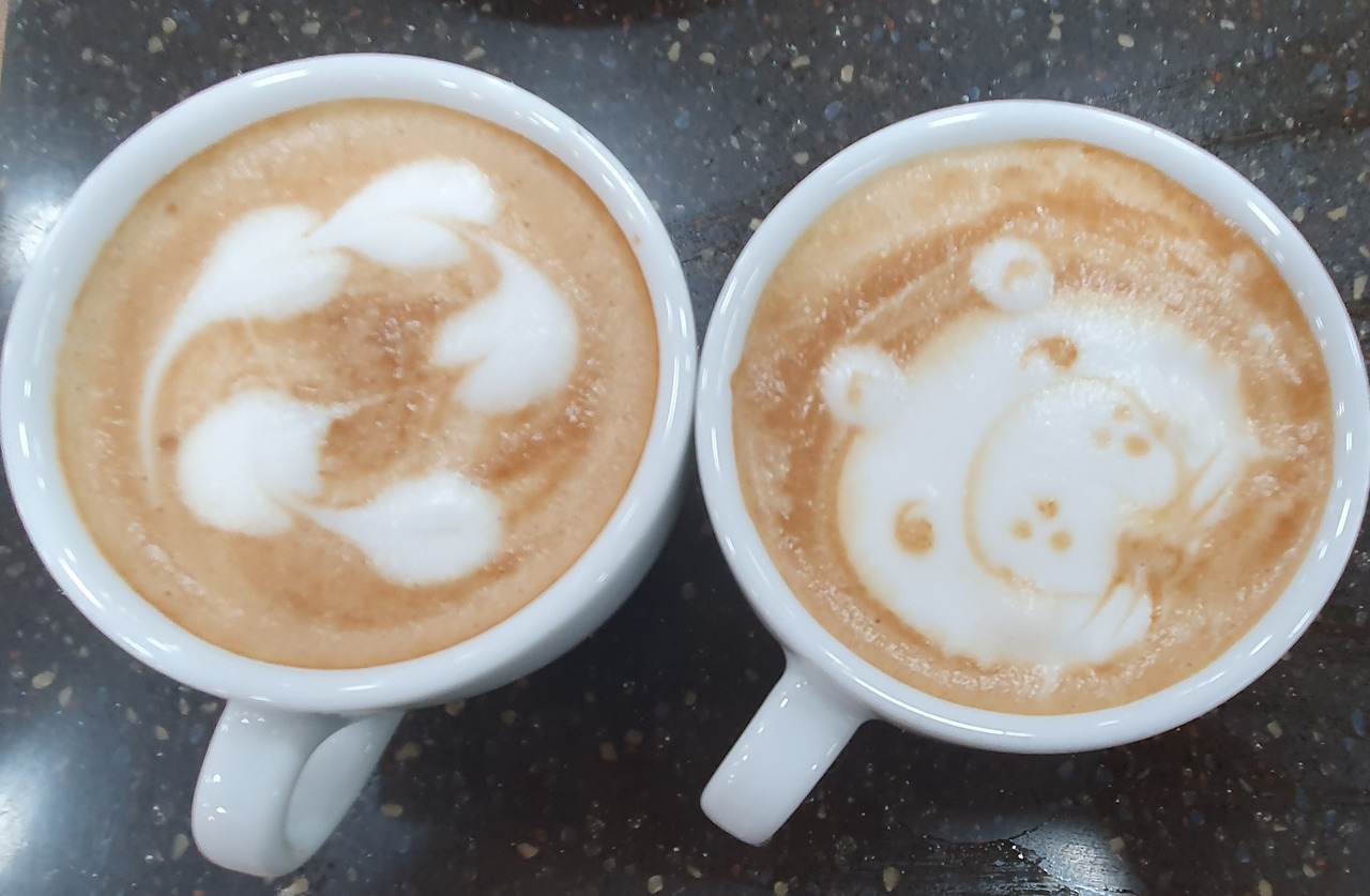 그다음은 스티밍이다. 첫 번째 스티밍은 성공 두 번째 스티밍은 뭔가 아쉬웠다. 차분히 마음을 가다듬고 카푸치노 잔을 기울여 푸어링을 시작했다. '하던 대로 하면 돼~ 자신 있게' 마음속으로 주문을 외우고 우유를 에스프레소 깊은 곳에 떨구었다. 다행히 경계는 흐트러지지 않고 동그란 모양이 나와주었다. 마지막 카푸치노에 우유 양이 아주 조금 모자랐던 것 빼곤 그런대로 만족할만한 카푸치노였다.