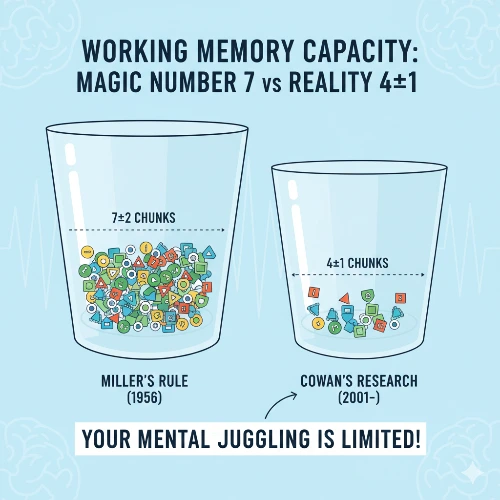 1956년, 하버드 대학의 인지심리학자 조지 밀러(George A. Miller)는 인간의 단기 기억 용량이 약 7개(±2)의 정보 덩어리로 제한된다고 주장했습니다. 유명한 '매직 넘버 7' 이론입니다. 그러나 최근의 신경과학 연구(넬슨 코완 등)에 따르면, 보조 전략을 사용하지 않는 순수한 작업 기억 용량은 4개(±1)에 불과합니다.