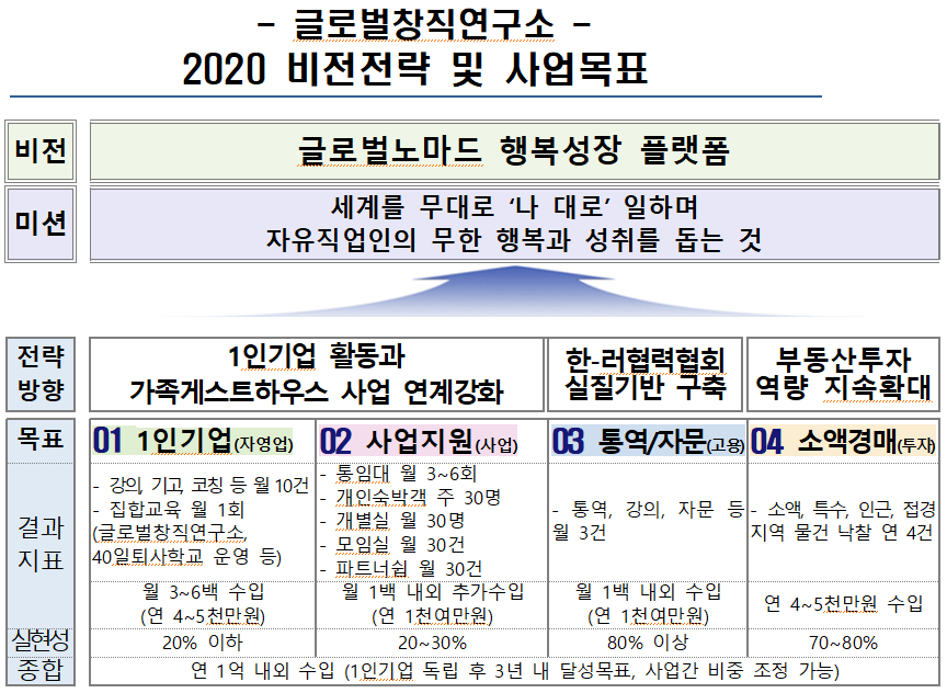 아래 표는 공공기관 업무 경험을 살려 만든 원페이지 사업 실행계획서 중 일부이다. 목표 수립부터 실행, 점검보완까지 한눈에 보고 관리할 수 있게 했다. 1인 기업을 꿈꾸는 사람들의 체계적 목표관리 위해 이 계획서 활용법도 추후 공유할 예정이다. 2020년은 쓴 대로 다 이루는 실행력을 높이는 한 해가 되기 바란다. 평생직업 비전에 한발 더 성큼 다가서는 1인 기업가적 인생을 맘껏 펼쳐보자.