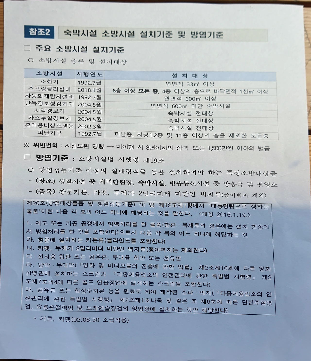 "이런 것 말고요. 휴대용 비상조명등이라고 소방용이 있습니다."라고 지적하고는 방 전등 스위치 비스듬히 조금 윗부분에 부착하라고 했다. 각 방에서 비상구까지 탈출 경로를 그린 안내도도 비치해야 된다는 설명과 함께. 여기까지는 좋았다.