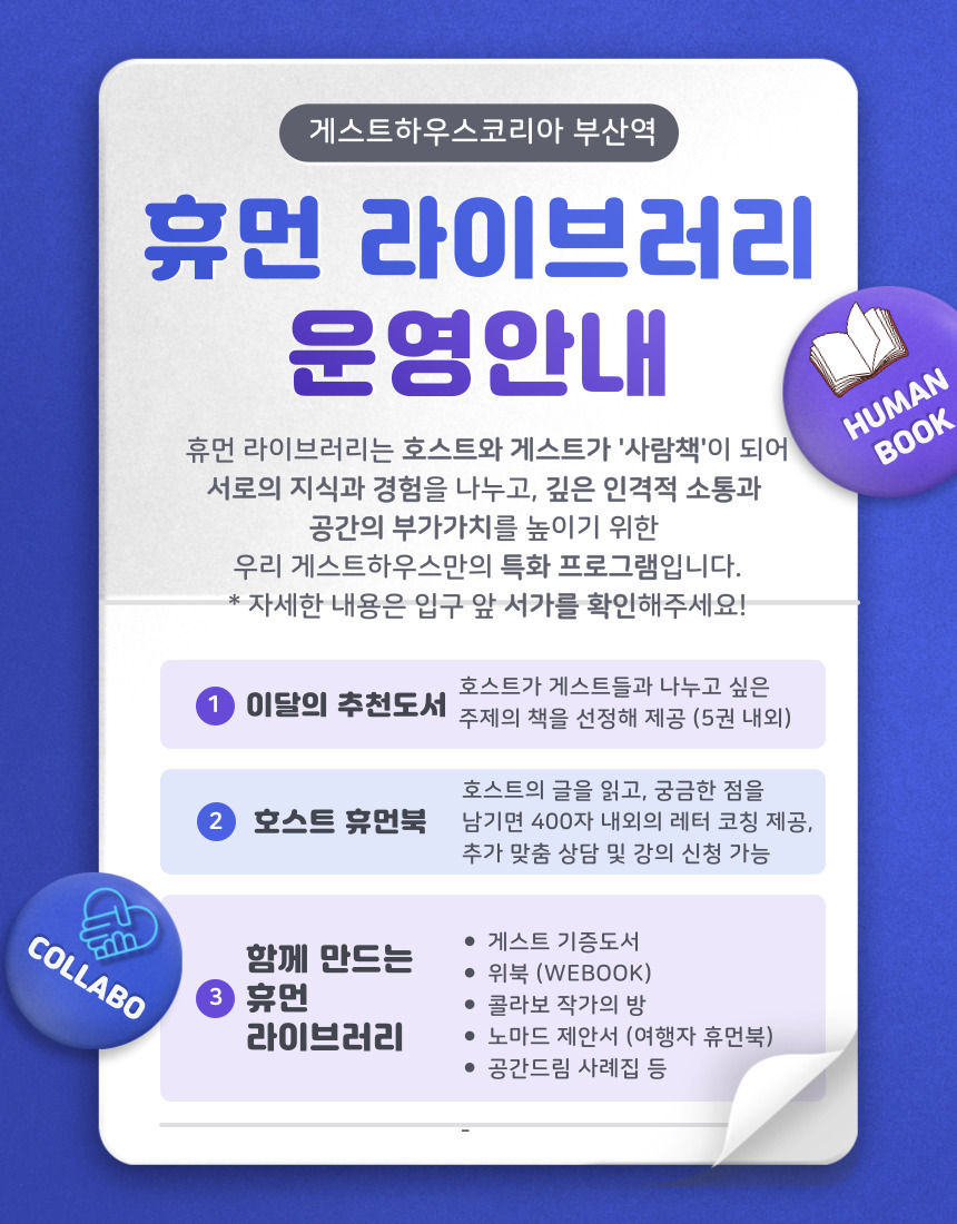 '게스트하우스에 휴먼 라이브러리'라니. 근데 좀 생뚱맞지 않나. 이 조합은 좀 더 '사람 냄새'나는 숙소를 만들고자 하는 바람에서 나왔다. 아이러니하게 그 시작은 '무인화 숙소' 운영 계획이다. 코로나가 터진 뒤 한창 비대면 바람이 불었다. 여러 사람이 효율성을 위해 공간을 쪼개고 나눠 쓰던 공유 서비스 등이 우선 타격을 받았다. 게스트하우스도 그중 하나였다. 이후 셀프체크인 등 비대면 서비스를 활성화하고 안내사항도 최소화했다. 인사 나누기조차 부담스러울 때도 있었다. 이런 시기를 거치면서 운영자의 숙소 상주 시간도 자연히 줄어들었다. 그러다 보니, 호스트와 게스트 간 간격도 벌어졌다. 작은 불편에도 나쁜 댓글을 다는 경우가 늘었다. 코로나 이전 "주인장이 친절하다" 식의 댓글도 점점 줄었다. 시도 때도 없는 게스트들의 요구를 만족시키기는 더 힘들었다. 그렇다고 마냥 숙소 운영에 시간을 쏟아부을 수도 없었다. 시간도 자원도 에너지도 넉넉지 못한 1인 가족기업의 한계 덕분이다. 그래서 간단한 입실 안내 등은 아예 무인화하고 서비스 이용시간 등을 확실히 고지해 두기로 했다. 호스트와 게스트 간의 오해를 줄이기 위해서다. 대신, 양자 간 휴먼 라이브러리를 열어 인격적 소통을 늘리고 공간의 부가가치를 높이는 데 힘쓰기로 했다. "싼 맛에 별 기대 없이 오는 곳", "어쩔 수 없이 하는 일"이 아니라, 방문객도 주인장도 설렘을 가지고 만날 수 있는 '의미 있는 공간'이 필요했기 때문이다.