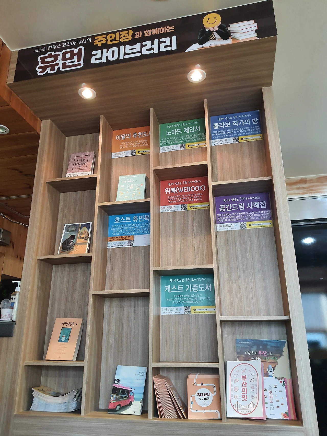 이런 염원을 담아 게스트하우스 내 휴먼 라이브러리 설치 공간을 마련했다. 새로 무슨 일을 할 때 마음이든 장소든 먼저 비운다. 그래야 채워진다. 구조화된 공간에서 뭐가 더 필요한지, 얼마큼 진행 됐는지를 한눈에 볼 수 있다. 다행히 게스트하우스를 하면서 공간만큼은 부자다. 몇 날 며칠을 먹고 자고, 놀만한 복합공간을 마련해 뒀기 때문이다. 숙박부터 모임까지 한 공간에 30-40명은 너끈히 들어간다. 휴먼 라이브러리 사업의 초기 아이디어는 단순했다. 바로 숙소를 이용하는 게스트들에게 호스트가 적어둔 브런치 글들을 공개하고 반응을 받는 것이다. 이 글들을 통해 소통하고, 더 관심 있는 주제는 유료 코칭, 강의, 기고 등으로 이어가는 것이다. 그런데 여기서 조금 더 나가, 실물 책자를 놓을 오프라인 공간도 함께 마련했다. 여행자들을 위한 추천도서 코너를 만들고, 게스트들과 함께 하는 휴먼북 사업도 추가했다.