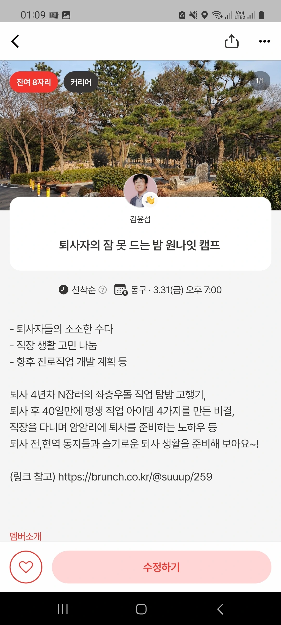 여기서 모임 제목과 관련 사진 및 소개 글을 넣으면 된다. 나 같은 경우는 마침 얼마 전 모임 개설을 위해 '서막' 격으로 써둔 글이 하나 있었다. 모임을 열고 관심자들을 초청할 마땅한 사이트나 SNS 기반이 없어 고민하던 차에 잘 됐다. 이 글의 제목을 그대로 따서 모임을 하나 만들었다. "퇴사자의 잠 못 드는 밤 원나잇 캠프"