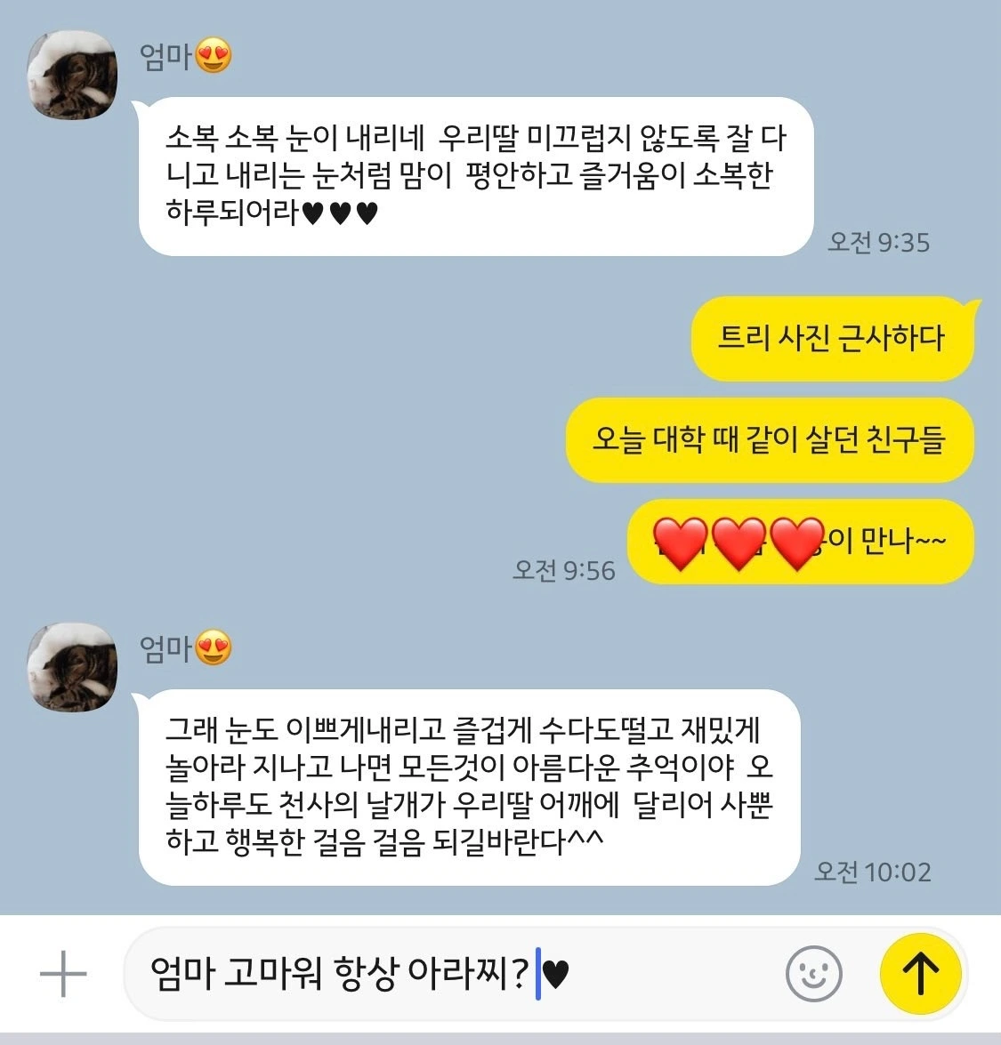 아무리 작은 것에도 감동하는 저이지만, 그래도 잊지 못할 감동을 준 사람은 절대 잊을 수 없는 것 같습니다. 그마저도 여럿이지만 망설임 없이 말할 수 있는 단 한 사람은 바로 저희 엄마입니다. 엄마는 늘 "네가 낙심할까 봐 그게 제일 걱정 돼."라고 우는 저를 다독여요. 어렸을 땐 정말 많이 싸웠는데 이제는 누구보다 친한 친구가 된 거죠. 제일 가까운 곳에서 저를 진실되게 봐주는 유일한 사람. 울 엄마 사랑해.