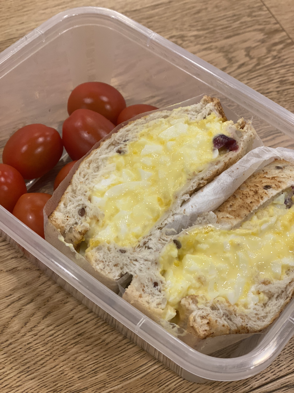 - 재료 : 통밀식빵 2장, 삶은 계란 2개, 소금 약간, 건 크랜베리 한 숟가락, 그릭요거트 1큰술