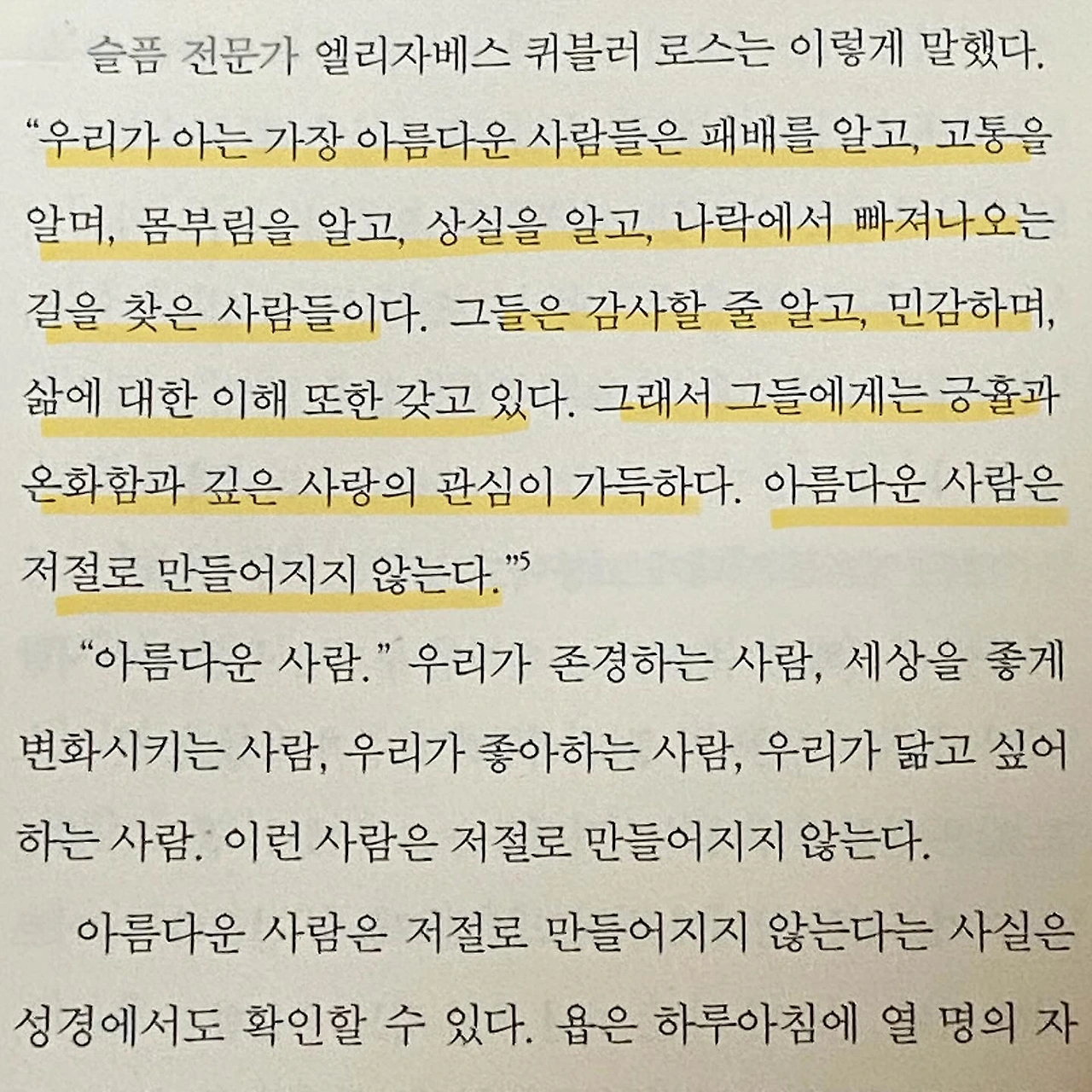 지은이도 인용했을 정도면 말 다했죠. 그리고 이 문장이 제가 앞으로 나아가야 할 방향이라고도 생각했어요. 이전에는 저에게 많이 몰입했다면 올해를 지나면서는 시선을 바깥으로 뻗어내어 다른 사람의 삶에 관심을 가지도록 작정하게 되었거든요. 그러려면 엘리자베스 퀴블러로스가 말한 저 이야기가 저로부터 솔직하게 펼쳐져야 하니까요. 저번 편지에서 말했던 것처럼 저는 어려움을 겪고, 실패를 이야기하면서 크고 싶거든요. 그렇다면 저는 지금 아름다운 사람으로 만들어지는 과정인 걸까요?