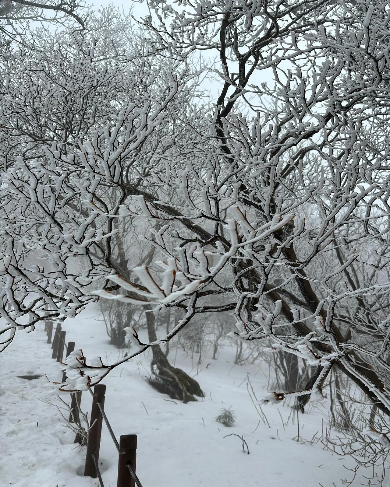 아침 4시에 기상하여 5시 30분에 ktx를 타고 1시간을 달려 대전에 도착했습니다. 덕유산이 있는 무주까지는 대전에서 렌터카로 1시간을 더 들어갔어요. 간단한 준비운동 후 지체없이 출발. 입구에서부터 정상 향적봉까지는 1,600m로 4시간이 소요된다고 하던데, 저희는 4시간 30분 정도 걸렸습니다. 초반 웜업 지점인 백련사까지는 아스팔트와 흙길을 걸었다면 그다음부터는 본격적으로 얼음이 쌓인 길에 진입하게 됩니다. 거기에서 아이젠을 끼우고 숨 가쁘게 오르다 보면 상고대가 서서히 보이기 시작하죠. 눈꽃산행만이 누릴 수 있는 절경입니다.