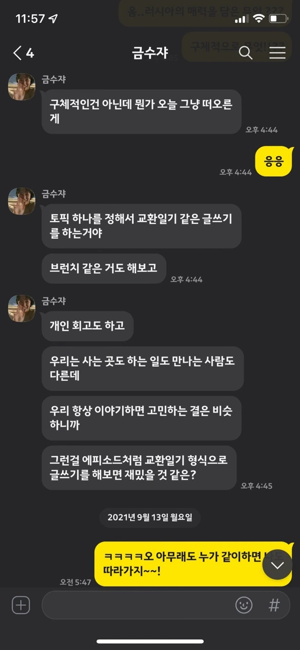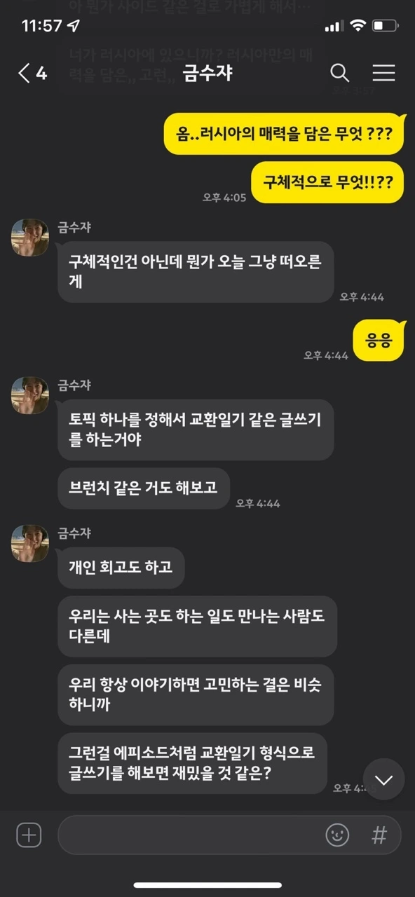 꿈도 많고 욕심도 많은 성격에 깜냥도 안 되면서 부딪혀 봤던 과거의 다양한 경험들이 모이고 모여 현재 모스크바에 있게끔 하네요. 미래에 대해 초조하고 불안한 고민들로 20대의 수많은 밤이 스쳐 지나가는 밤입니다. 뭐, 사실 지금도 ‘어떻게 살아야 하나’라는 고민은 끝이 없지만 30대가 된 지금은 조금은 덤덤하게 고민과 삶의 무게를 견뎌내는 인내가 생긴 듯합니다. 수지와 교환일기 프로젝트로 인해 20대분들에게는 용기를, 30대 분들에게는 공감을, 40-50대분들에게는 재미를 선사했으면 합니다.