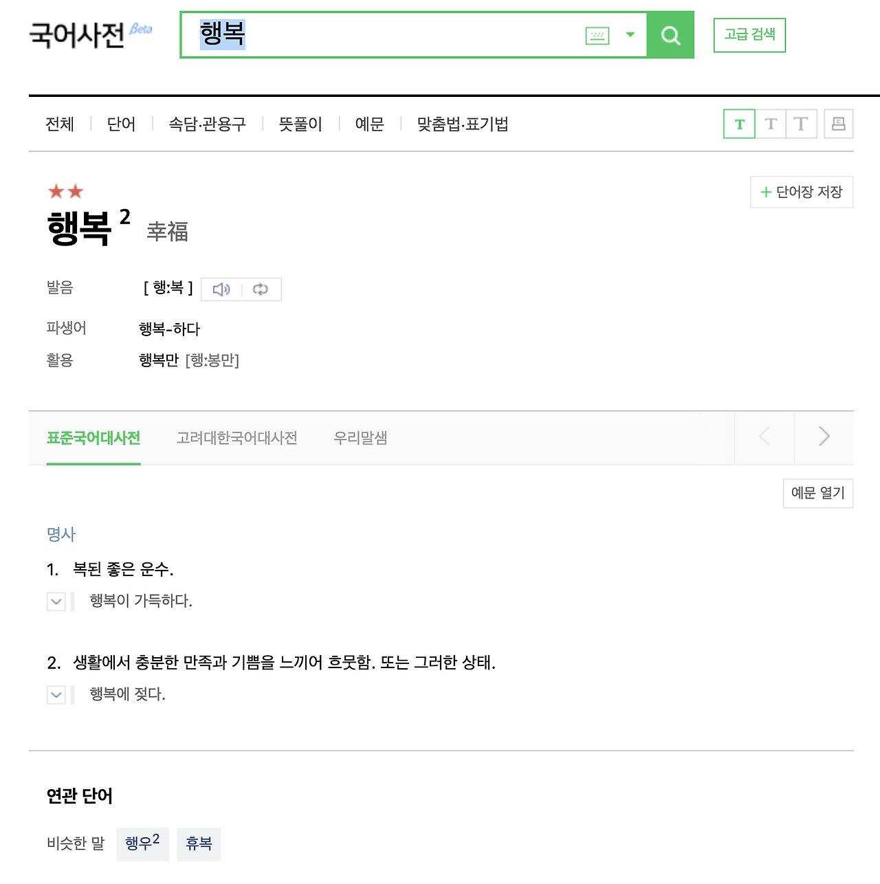 행복이 어떤 것이었더라. 사전적 의미를 찾아보았다. 아마 보통의 행복은 명사 2번의 뜻처럼 쓰이는 것이겠다. '생활에서 충분한 만족과 기쁨을 느끼어 흐뭇함. 또는 그러한 상태' 그렇다면 '행복하다'라는 감각을 느낀 지 오래된 것 같다는 지금의 나는 '생활에서 충분한 만족과 기쁨을 느끼어 흐뭇하지 못한 상태'에 있는 것일까.