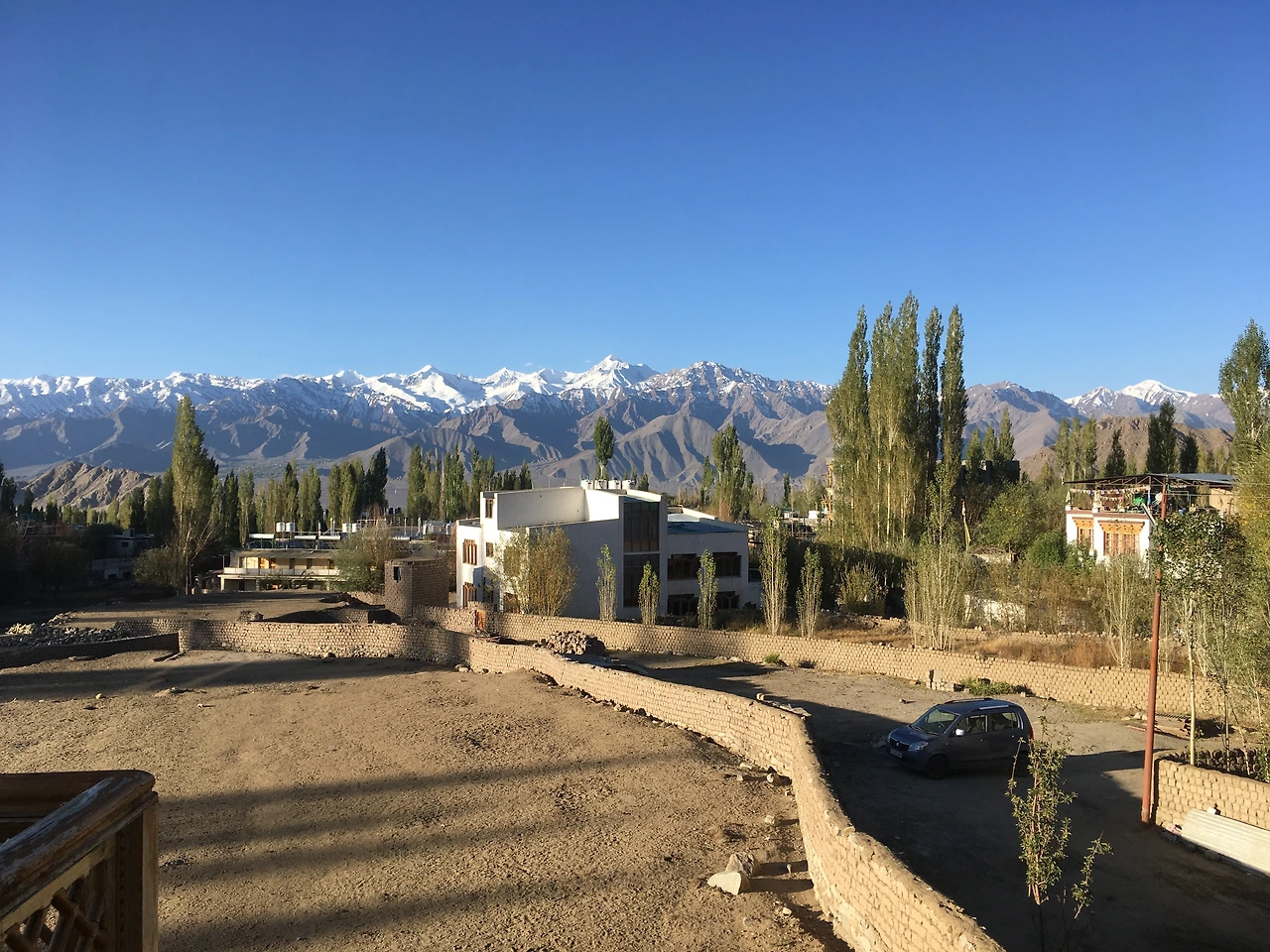 무사히 레 공항에 도착! 비행기에서 내리자 공항을 둘러싸고 있는 돌산들이 제일 먼저 눈에 들어왔다. 그 풍경은 굉장히 이국적이었는데, 뭔가 우리가 전혀 새로운 장소에 도착했음을 충분히 느끼게 해 주었다. 레에 관하여 제일 우려한 점은 첫째도 둘째도 고산병이었고, 셋째는 추위였다. 배낭을 찾고 외국인 여행객 작성 종이를 적고 있는데 벌써 조금씩 숨이 차는 게 느껴졌다. 공항 옆 택시 부스에서 택시를 잡고 남편이 미리 예약해 놓은 숙소로 이동을 했다. 숙소로 향하는 중 구글 지도에 찍힌 호텔 위치와 택시기사가 알고 있는 위치가 달라서 살짝 멘붕이 왔지만 일단 택시기사의 확신에 찬 태도를 믿을 수밖에 없었다. 구글 지도는 이미 한참 빗나간 지 오래- 기사가 내려준 곳에서 어찌저찌 일단 걸음을 옮겨 보았다. 날은 맑았고 햇볕은 따뜻했으며 주변은 조용했다. 이리저리 골목을 두리번거리며 주변을 탐색해 보았다. 어디에도 호텔이라는 간판은 보이지 않았다. 발길 닿는 대로 돌아다니고 있는데 한 남자가 보인다. "empyrean house?!" "yes yes" 다행히 호텔 주인을 눈앞에서 만났다. “yes~!”