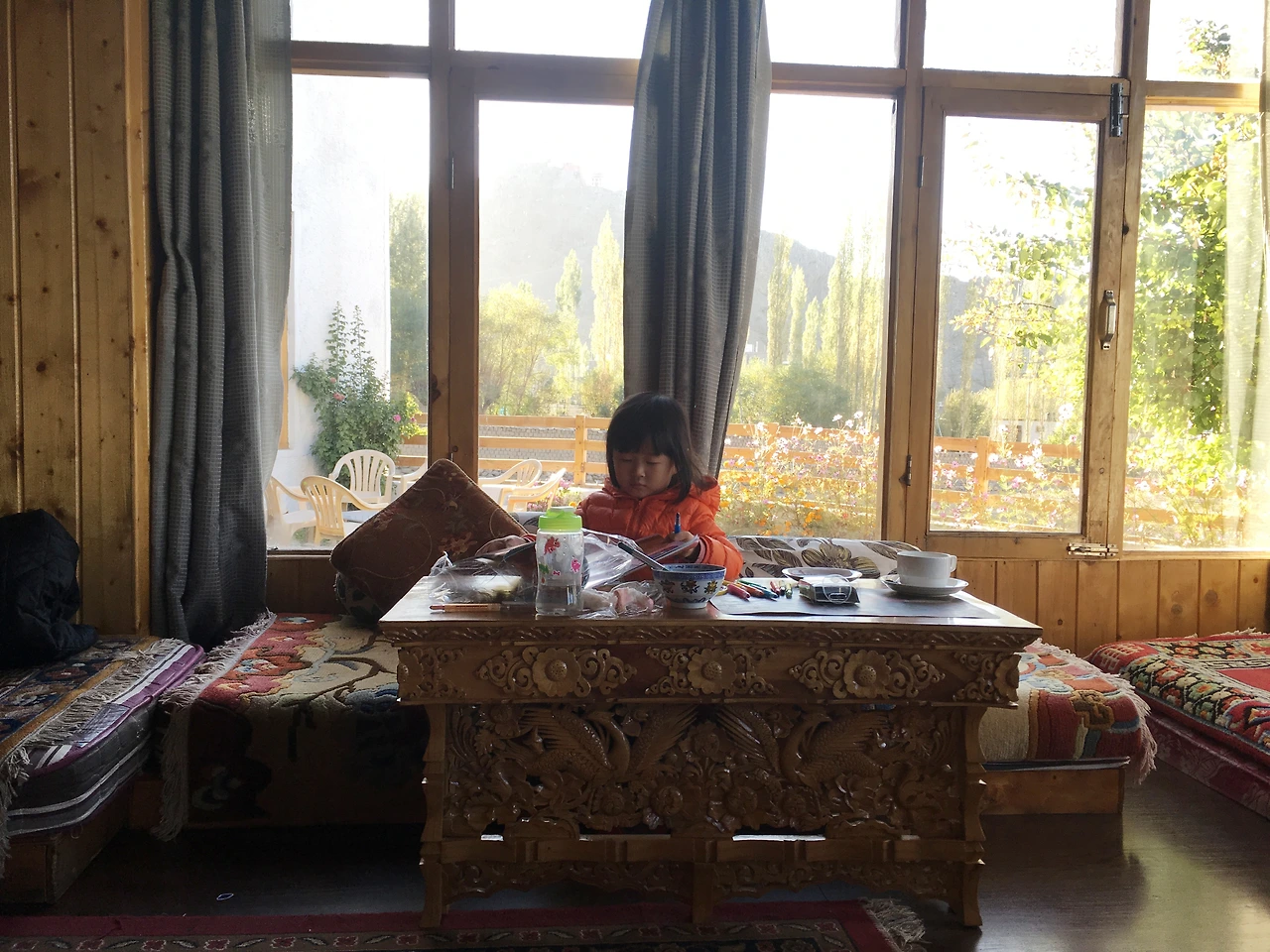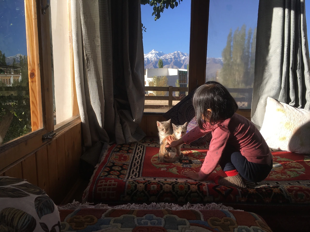 다음날 아침에 눈을 떴는데 응? 뭐지?- 폐가 조금 묵직한 것 빼고는 훨씬 몸이 괜찮아졌다. 그리고 너무나 다행스럽게도 아이의 토기는 완전히 멈췄고 일어나자마자 식욕이 돌았는지 맘마를 먹겠다고 했다. 안 그래도 토하느라 종일 아무것도 못 먹은 게 마음에 걸렸는데, 당장에 주방으로 내려가서 한국에서 싸온 누룽지를 푹 익혔다. 조금씩 조금씩 떠먹여 주니 잘 받아먹었다. 그 후 상태가 호전된 아이는 이것저것 놀거리를 가지고 놀기 시작했다. 언제 그랬냐는 듯, 숙소 고양이를 쫓아다니며 놀았다. 다행이다 정말 다행이야.. 감사하게도 라다크는 우리를 내려 보내지 않았다.
