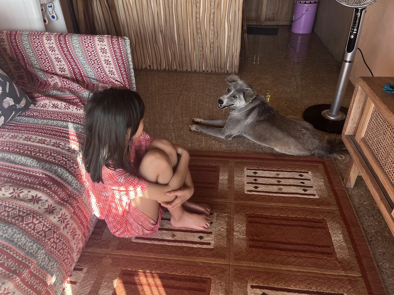 낮에는 회색 늑대를 닮은 개도 잠깐 왔었다. 마루에 누워있는데 갑자기 늑대 한 마리가 눈앞에 나타나서 화들짝 놀랐다. 자세히 보니 개였는데 너무 커서 겁을 먹었다. 유일하게 첫째 아이만 개를 무서워하지 않았는데 어쨌거나 주인에게 연락을 했고, 주인은 개 주인에게 연락을 하겠다고 했다. 개는 이웃집 개였다. 이후 개는 돌아갔지만 이날도 다음날도 다시 찾아왔고 나중에는 그냥 개와 같이 있었다. 결국 우리의 친구가 되었다. 근처 구멍가게에 갈때도 개가 앞장서서 우리를 안내해 주었는데 첫째는 그것을 굉장히 재밌어 했다. 개도 우리가 편했는지 숙소의 주인인양 마루 정 중앙에 누워 쿨쿨 자는데 그 모습이 니중엔 그저 너무 웃겼다.