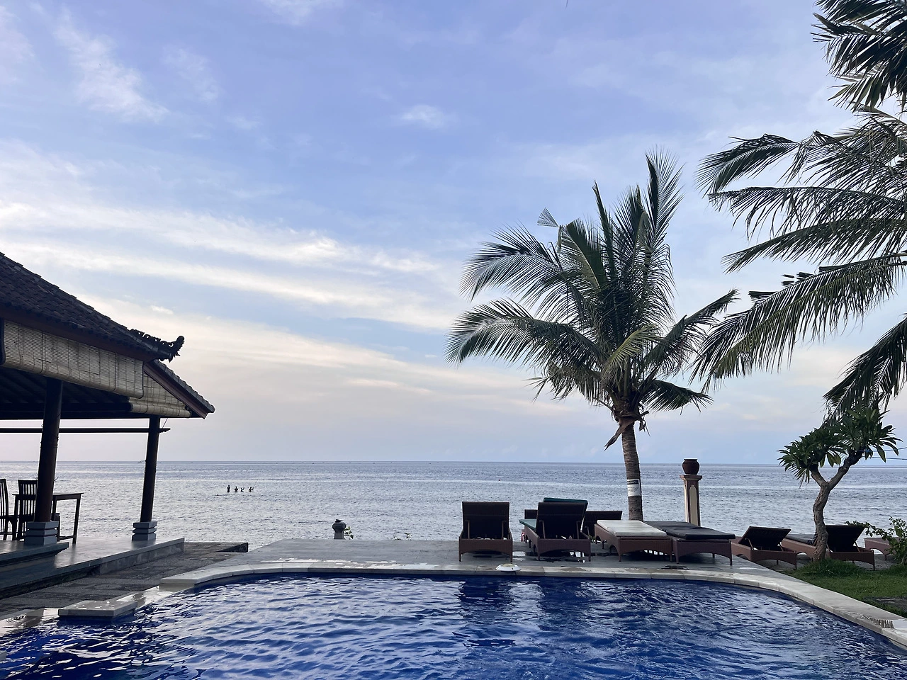 아메드에 오자마자 이곳에서 오래 있겠구나 하는 느낌이 팍 왔다. (실제로 우리는 아메드에서 가장 오래 머물렀다. ) 1박에 6만 원 정도 하는 가성비의 숙소는 나쁘지 않았고 (실로 아주 훌륭했다) 위치도 아메드 해변으로 바로 이어지는 곳이었다. 도착하자마자 근처 식당에서 식사를 했다. 둘째는 그때까지 누워있다가 처음 일어나 과일 주스를 먹었다. 첫째는 숙소 수영장에 오후 2시 30분에 들어갔는데 밤 7시가 다 되어서 나왔다. 이곳에서부터 둘째는 토하지 않았고 끓여준 누룽지 미음을 조금 먹더니 활기를 되찾기 시작했다. 급 기력을 회복하여 누나를 따라 수영복을 입고 수영장에 들어가 놀기 시작했다. 둘째는 발리 도착 후 딱 3일 간만 아프다가 이후로는 쌩쌩했다. 지금까지도 건강히 잘 지내고 있다. 다행히 가족 모두 별 탈없이 잘 여행하였다.