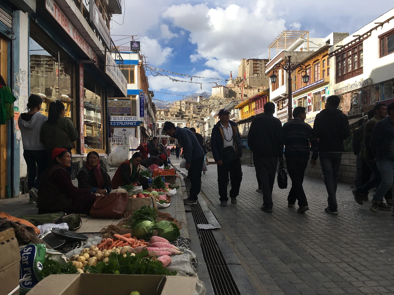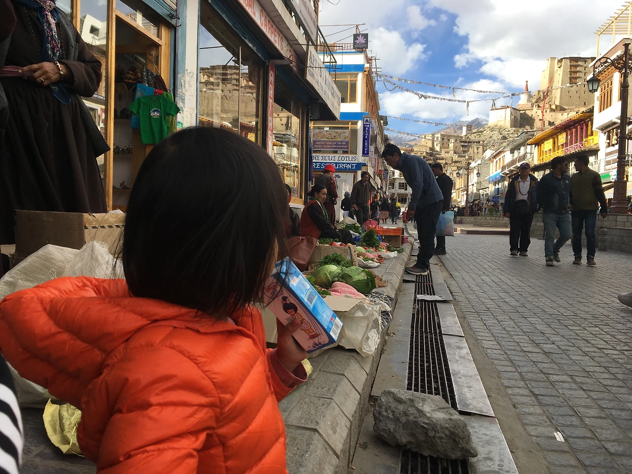 고산증에 적응하기 위한 이틀간의 휴식 끝에 3일째가 되어서야 숙소를 벗어났다. 드디어 레의 메인 바자르를 거닐어 볼 수 있었다. 상점들이 슬슬 문을 닫기 시작한다는 소식이 들려왔지만 다행히도 메인 바자르의 식당과 상점들은 거의 문을 열고 있었다. 거리에는 채소와 과일을 파는 여인들이 있었고 높은 언덕에 레 왕궁이 올려다 보였다. 달이가 좋아하는 우유와, 주스, 과일, 간식, 그리고 놀랍게도 한국 라면까지- 우리는 마트에서 오랜만에 식량을 잔뜩 보충할 수 있었다. 사진으로만 보던 메인 바자르를 실제로 직접 걸어보니 기분이 매우 이상했다. 꿈꾸던 것이 현실이 되는 그 묘한 기분. 오랜만에 그 울림을 다시 느낄 수 있었다. 내가 정말로 여기에 왔구나. 두 발로 직접 거닐어보니 실감이 났다.