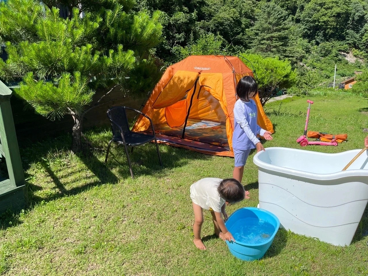 주말의 즉흥 집 캉스 - 외출을 할까 하다가 그냥 마당 한편에 그물막을 치고 욕조를 꺼내어 지하수를 받았다. 별거 아닌데 썩 괜찮은 캠핑 느낌이 난다. 아이들이 물에서 노는 동안 주방에서 과일을 꺼내오고 남편과 맥주 한 캔을 나누어 마신다. 크아!. 이것도 나쁘지 않다. 굳이 어디를 가지 않아도 되겠다. 그래 전원주택에 사는동안 이런 장점을 많이 누려봐야지